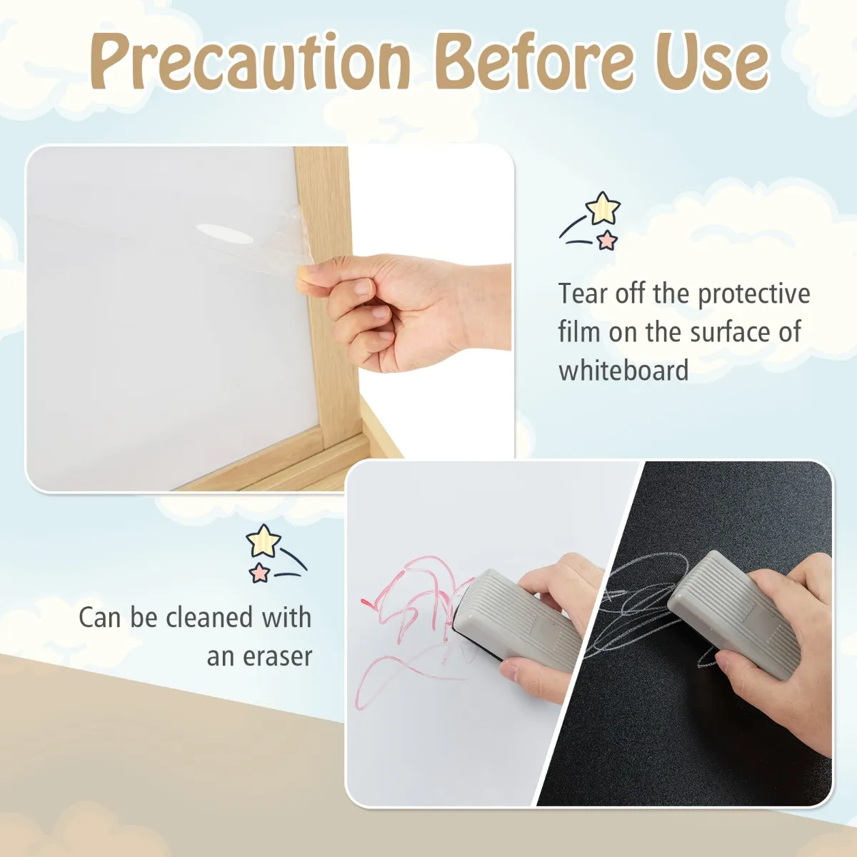 3-in-1 ezel: Deze houten schildersezel beschikt over tekenoppervlakken aan beide zijden en een houder voor een papierrol. Het krijtbord kan met krijt worden beschilderd, terwijl je kinderen op het whiteboard de bijpassende pennen zonder stofontwikkeling kunnen gebruiken. Je kunt bovendien papier van de rol naar beneden afwikkelen en met twee magneten bevestigen om erop te kunnen schilderen.
