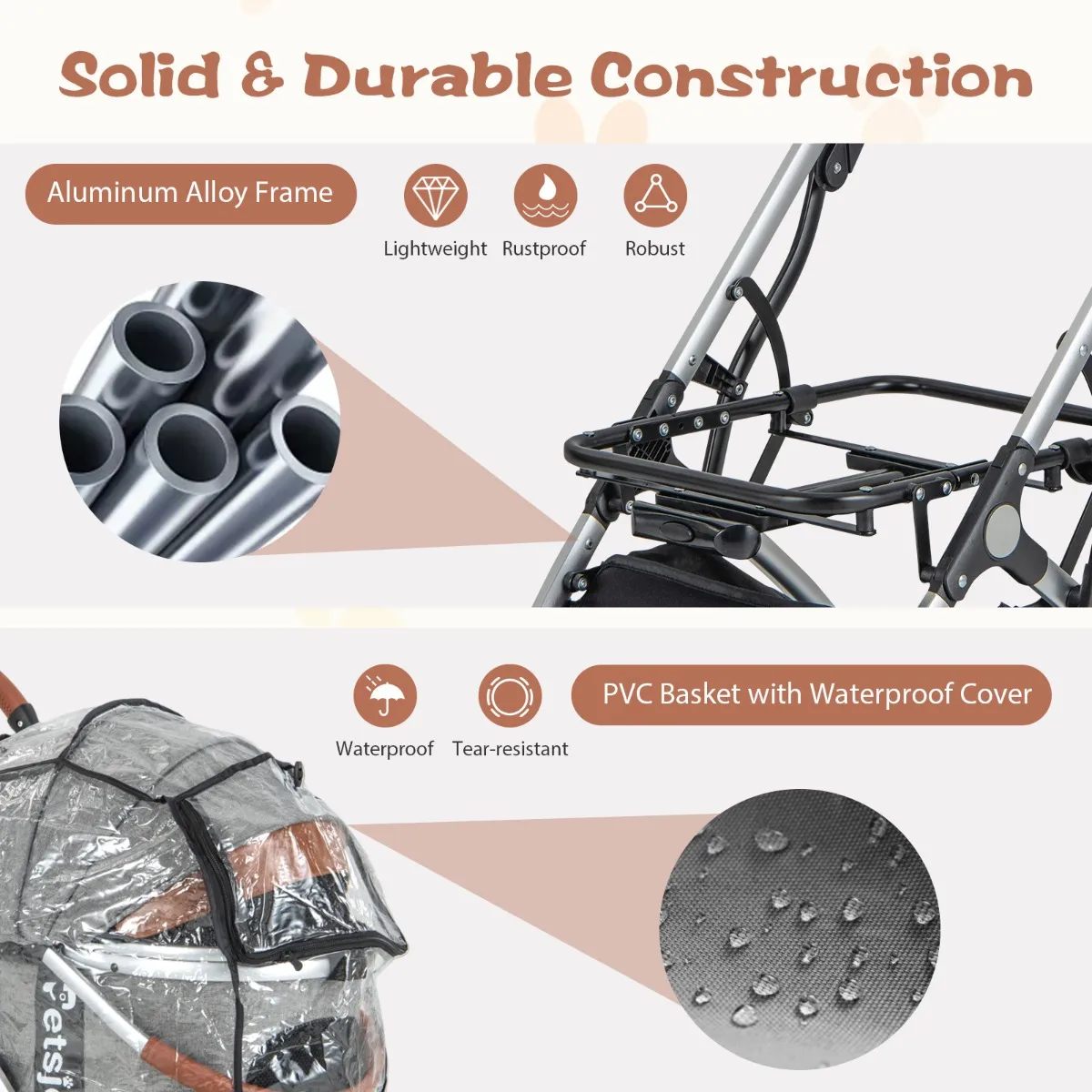 Onze kinderwagen kan ook gebruikt worden als reismand of autostoel. Hij is geschikt voor kleine tot middelgrote huisdieren. Met een zonnekap en gaasramen biedt hij een schaduwrijke, ademende ruimte. Het ritsloze ontwerp en de veiligheidsgordel voorkomen dat ze ontsnappen. Hij is gemaakt van een roestbestendige aluminiumlegering voor een hoog draagvermogen. De waterdichte hoes houdt je huisdier uit de regen. Het handvat heeft 2 verstelbare hoogtes en de voorwielen zijn universeel voor flexibele mobiliteit.