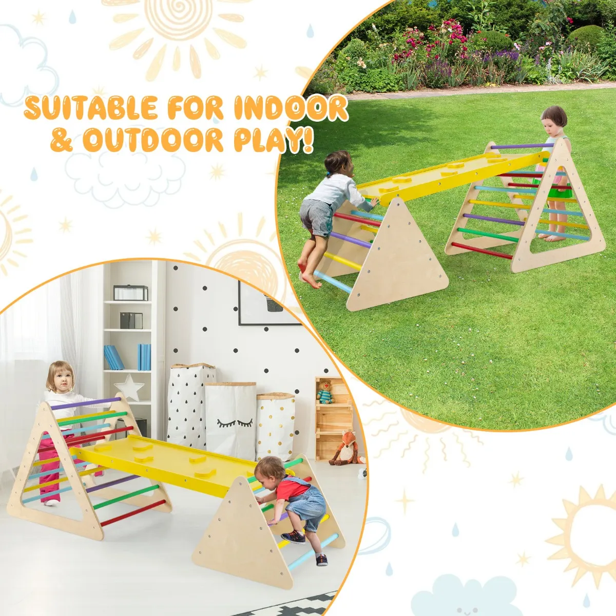 De 3-in-1 klimspeelset bevat 2 driehoekige ladders en 1 hellingbaan