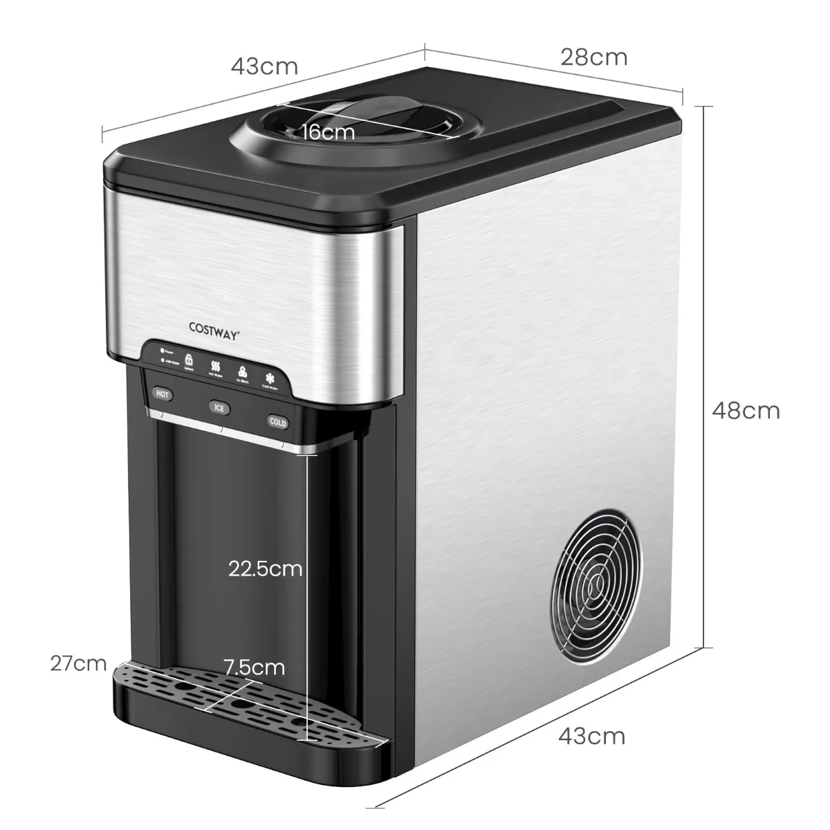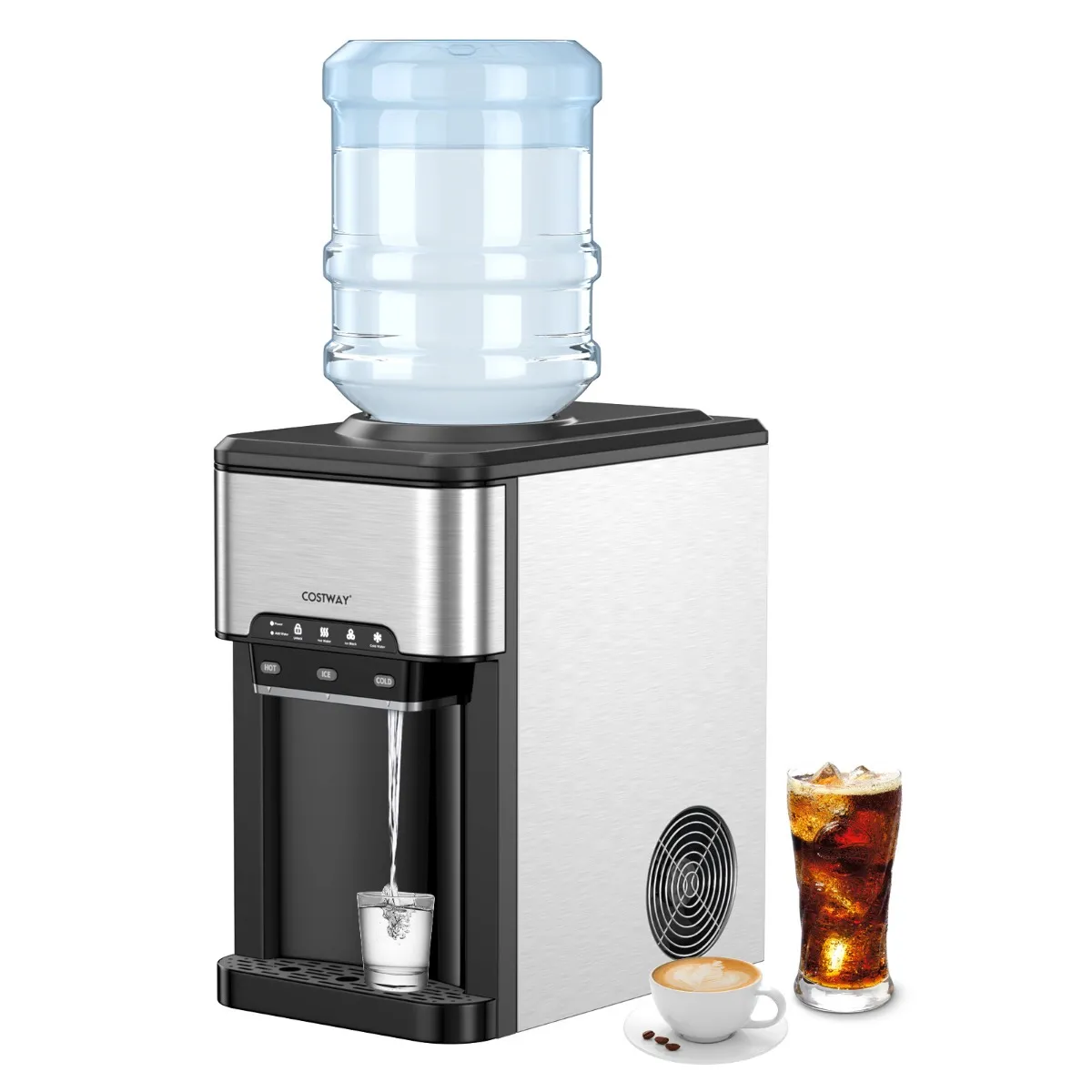 De waterdispenser geeft u de keuze uit drie temperatuurstanden, die u verwarmt in de koude winter en afkoelt in de hete zomer. U kunt warm/koud water en kogelvormige ijsblokjes krijgen met slechts één klik op het intuïtieve bedieningspaneel. Wanneer de watertank leeg is, zal de watertekort-indicator u hieraan herinneren. Belangrijker nog, het kinderslot biedt uw kleintjes en familie een goede bescherming. Uitgerust met een premium afzuigventilator, werkt deze waterkoeler stil en voert hij de warmte effectief af. U kunt hem plaatsen in de keuken, woonkamer, sportschool, kantoor, enz. Bovendien is het schoonmaken een fluitje van een cent dankzij de uitneembare lekbak.