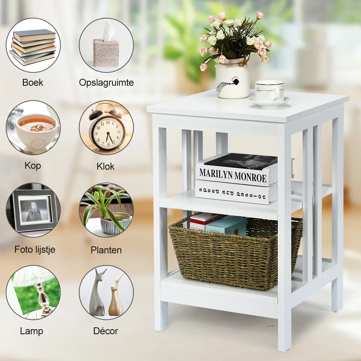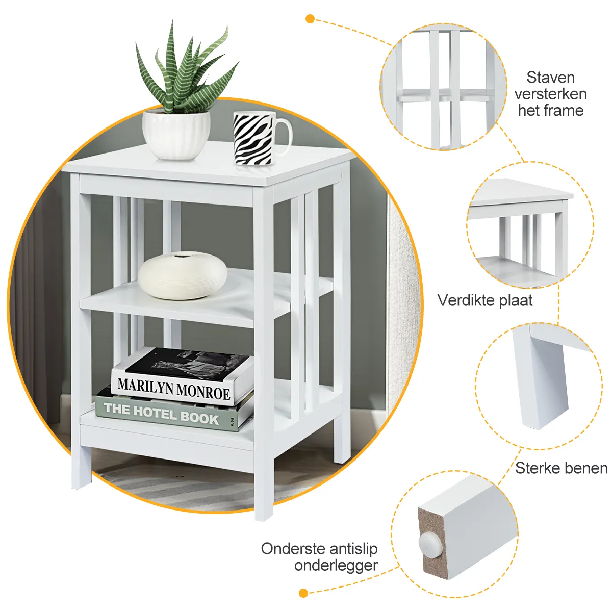 Gemaakt van geselecteerde kwaliteit en gespoten afwerkplaat, deze bijzettafel is waterdicht met een duurzame constructie. Wordt geleverd met twee open vakken, deze bijzettafel biedt voldoende opbergruimte voor bloemenvaas, decoratieve lamp of diverse leesmaterialen. Het gladde oppervlak van de bijzettafel voorkomt dat kinderen en ouderen verwondingen oplopen. En het is een perfecte decoratie met een elegant en stijlvol ontwerp. Bovendien is het eenvoudig te monteren met instructies en vereiste accessoires.