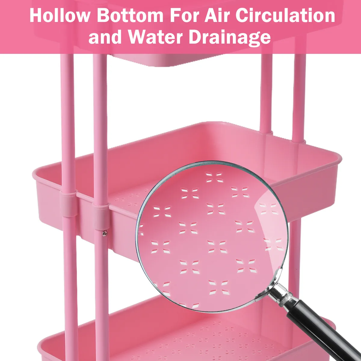 【Grote en praktische opbergwagen】Wordt geleverd met milieuvriendelijke ABS-opbergmanden met hoge afrastering, zodat deze rollende wagen voldoende opbergruimte biedt en ervoor zorgt dat items niet gemakkelijk te laten vallen. Extra gesneden holle bodem is handig voor drainage en zorgt voor een droge opslagomgeving.
