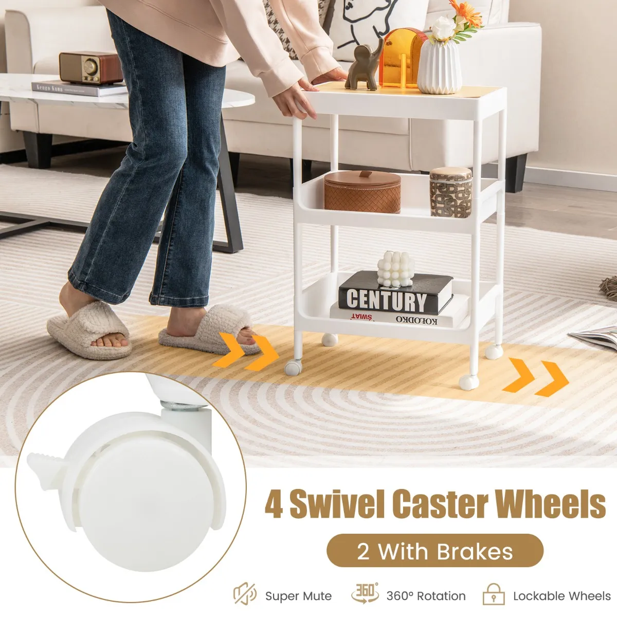 Eenvoudige beweging en stabiele structuur: Onze rolwagen is voorzien van een wit metalen frame dat zowel stevig als lichtgewicht is, en heeft vier 360° draaibare wielen voor eenvoudig verplaatsen. De twee vergrendelbare wielen zorgen voor extra stabiliteit wanneer u de wagen op zijn plaats wilt houden.