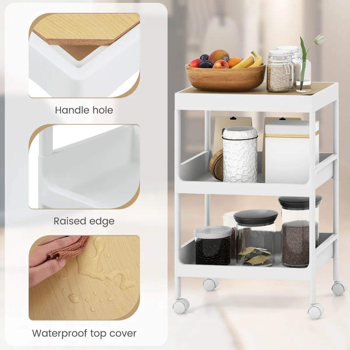 Onze rollende opbergwagen is niet alleen veelzijdig, maar ook stijlvol, waardoor het een essentiële opbergoplossing is voor elke ruimte in uw huis of kantoor. Met voldoende ruimte om al uw huishoudelijke artikelen op te bergen en een afneembaar bovenblad voor extra gemak, kunt u een laptop, tijdschriften, boeken of kopjes plaatsen. Het stevige witte PP-frame en het MDF-bovenblad maken de wagen zowel duurzaam als gemakkelijk schoon te houden. Bovendien zorgen vier soepel rollende wielen, waarvan twee vergrendelbaar, voor moeiteloos verplaatsen, stabiliteit en optimale ruimtebenutting in elke gewenste ruimte. Bovendien maximaliseert het unieke ontwerp effectief de opbergruimte en is het ideaal voor kleine ruimtes, waardoor het een functionele en trendy opbergoplossing is. Investeer vandaag nog in onze rollende multifunctionele wagen en geniet onmiddellijk van ongeëvenaard comfort en organisatie.