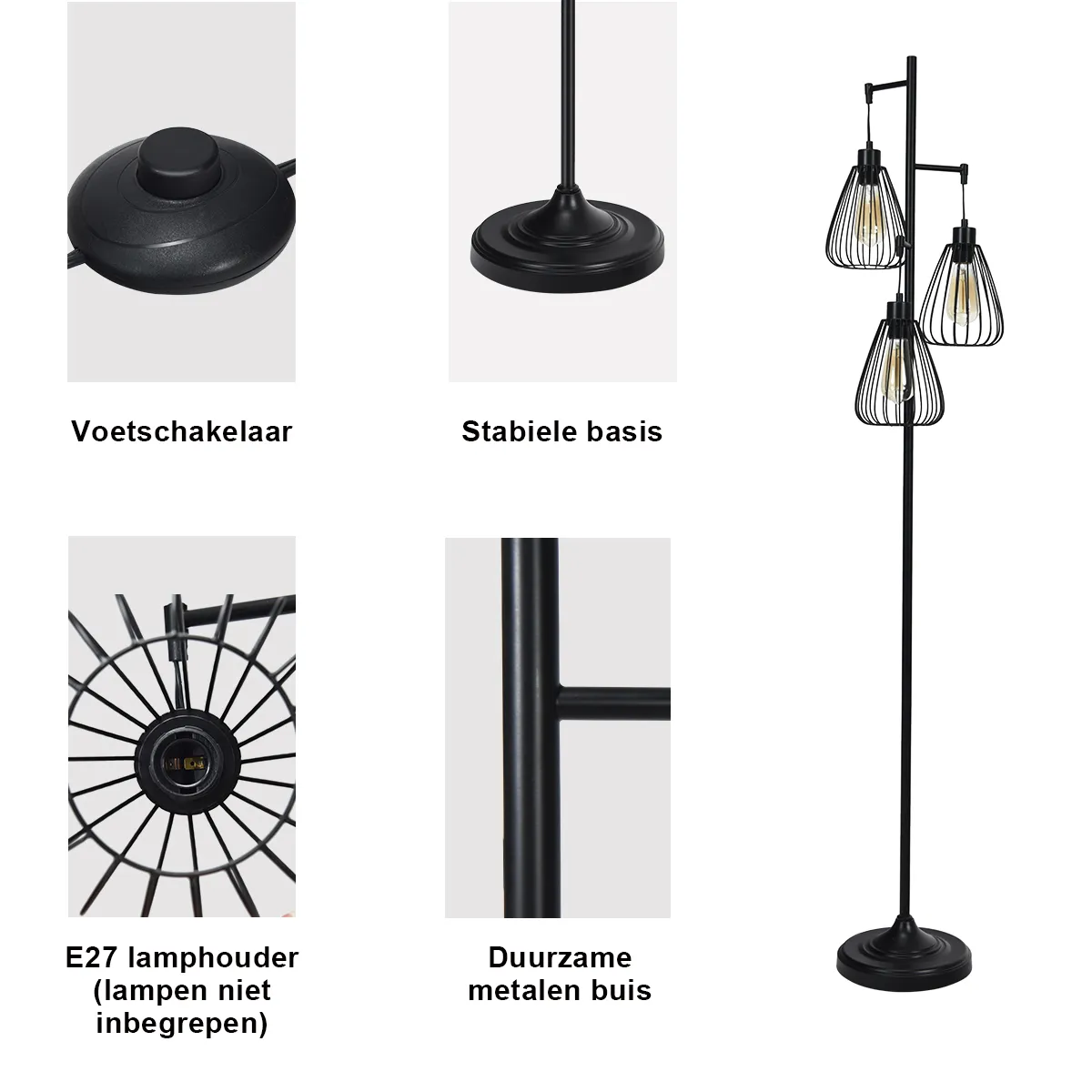 - Omvat: 1 x Metalen 3-Kop Vloerlamp1 x Instructie