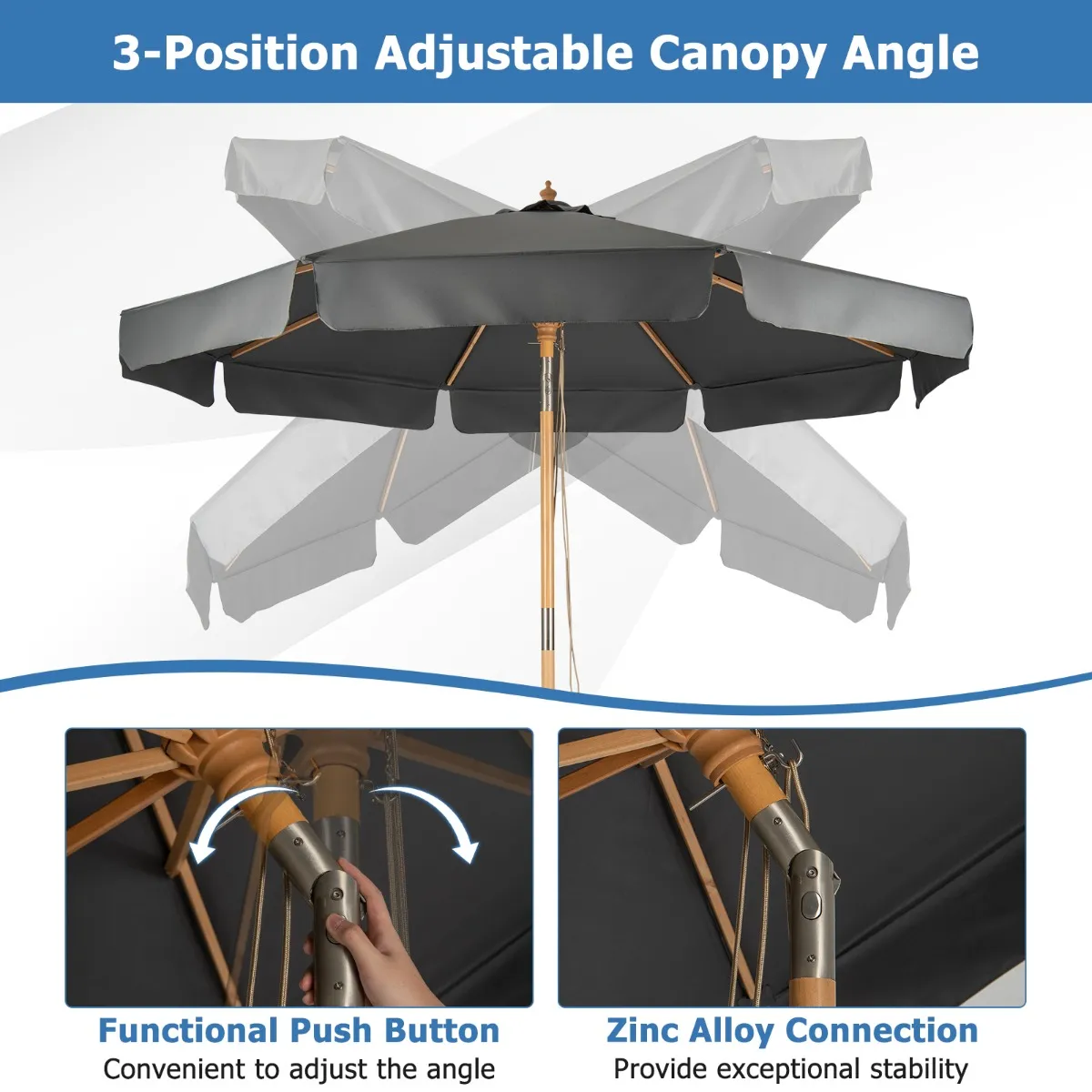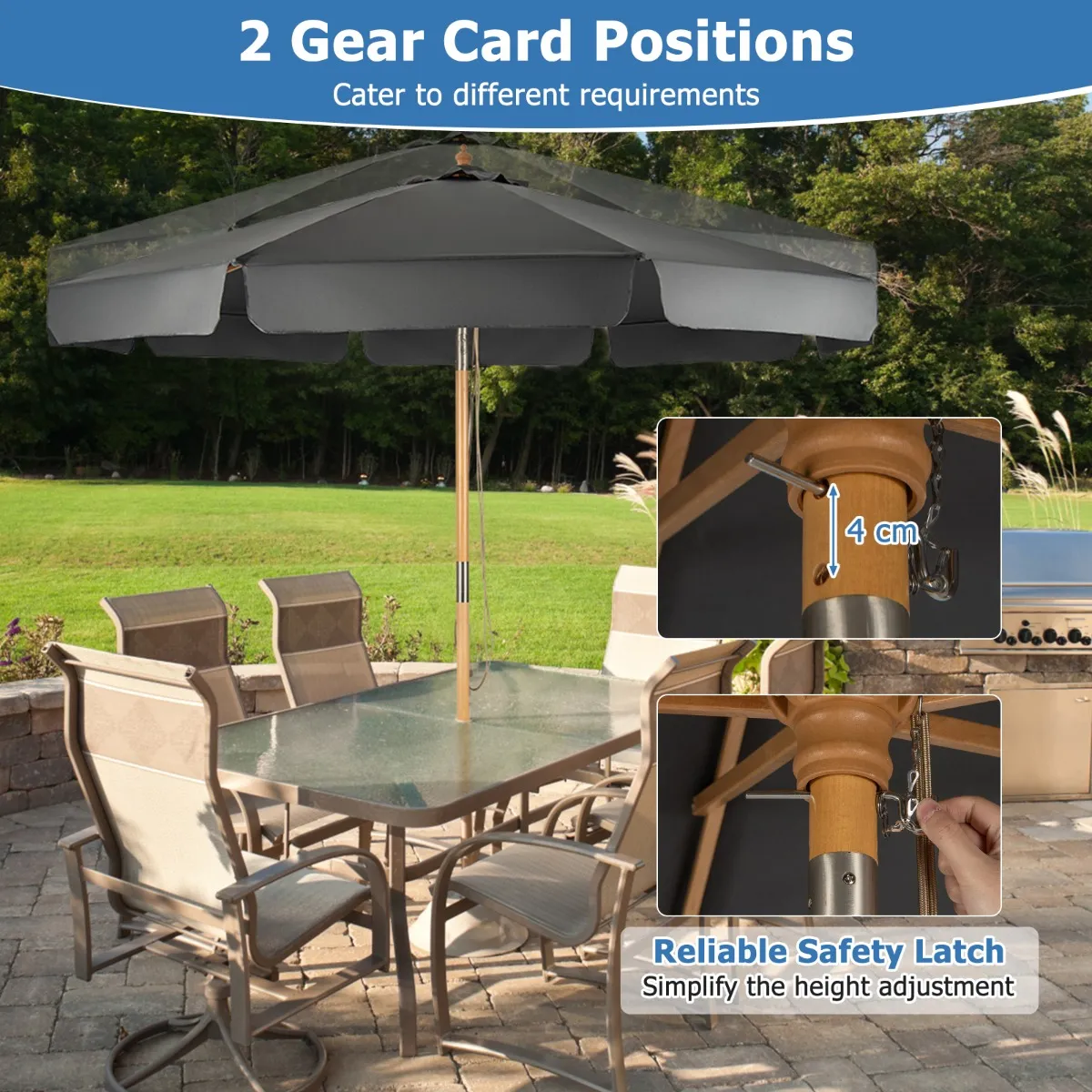 Geniet van optimale schaduw met deze 300 cm brede terrasparasol! De extra lange volant en het duurzame PA-gecoate polyesterdoek beschermen tegen de zon. De hoek en hoogte zijn eenvoudig aan te passen voor maximaal comfort. De stevige paal en 8 beukenhouten ribben zorgen voor stabiliteit, terwijl het katrolsysteem de bediening vereenvoudigt. Dankzij de geventileerde bovenkant blijft de luchtcirculatie optimaal. Perfect voor tuin, balkon of zwembad! Â