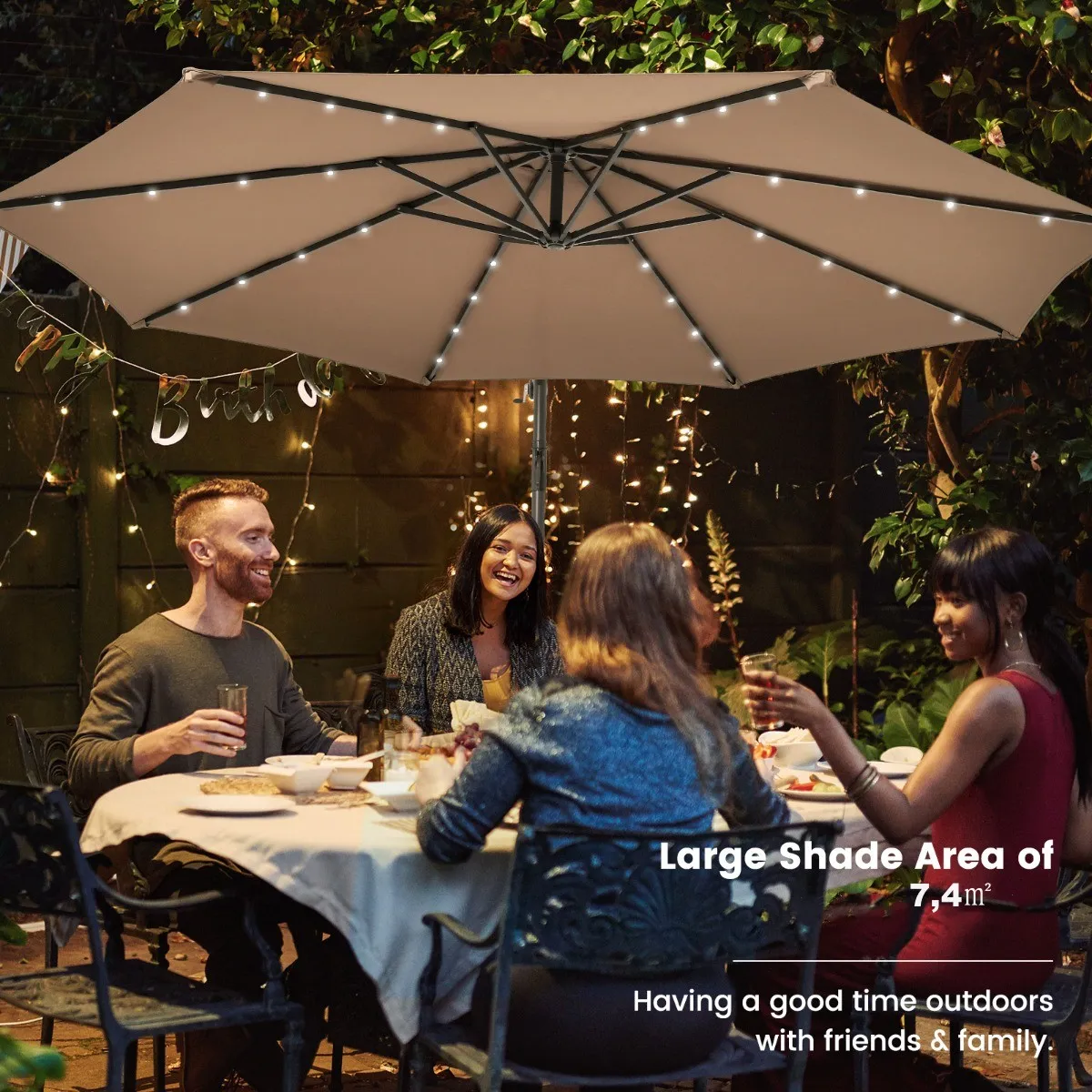 Breng mooie momenten buiten door met vrienden of familie! Met een grote overkapping van 3 m biedt deze praktische terrasparasol een ruim schaduwgebied voor uw buitenactiviteiten. U kunt de kantelhoek van de parasol eenvoudig aanpassen door de zwengel te verstellen om direct zonlicht te vermijden. Bovendien biedt het overkappingmateriaal van hoogwaardige polyester stof water- en UV-bescherming voor uw comfort. Nog beter is dat er 32 zonne-LED-lichten aan de ribben zijn bevestigd om uw nachtelijke activiteiten te verlichten. U hoeft zich geen zorgen te maken over de stabiliteit van de parasol, want met het solide metalen frame en de 2 lege zandsäcken (elk met 50 kg zand te vullen) is deze parasol stevig genoeg om slecht weer te doorstaan. Onze verspringende parasol is een geweldige aanvulling op uw buiteninrichting!
