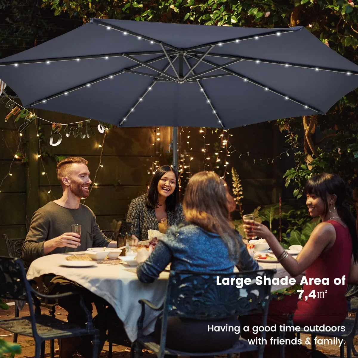 Zonne-LED-lichten: Uitgerust met 32 lampen op 8 ribben die uw buitenactiviteiten ’s nachts kunnen verlichten. Door de continue verzameling van zonne-energie gedurende de dag kunnen de zonne-energiebatterijen tot 6 uur verlichting bieden.