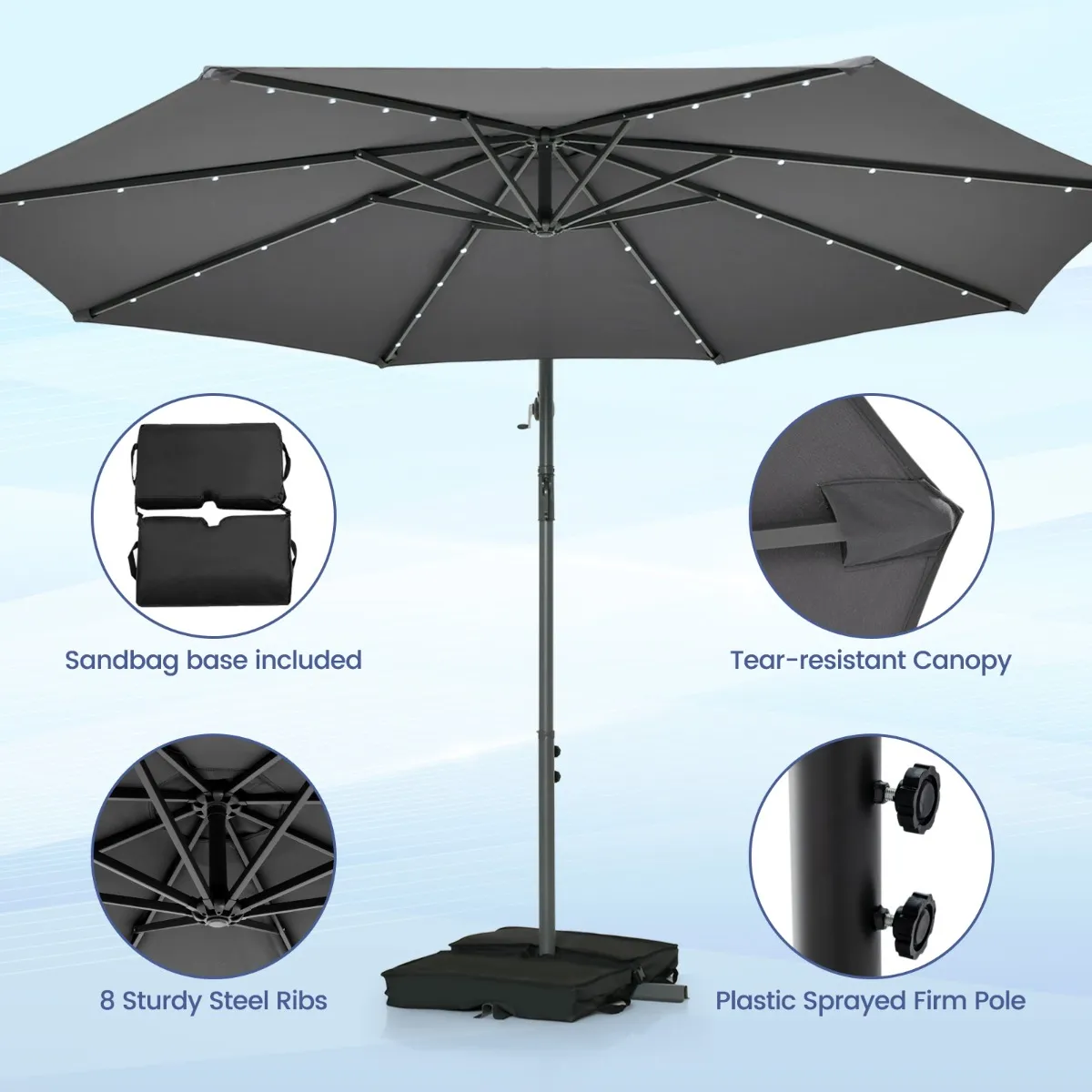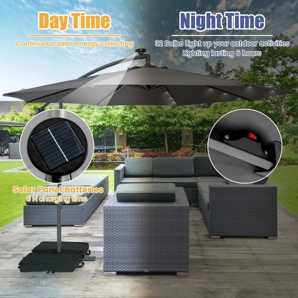 Breng mooie momenten buiten door met vrienden of familie! Met een grote overkapping van 3 m biedt deze praktische terrasparasol een ruim schaduwgebied voor uw buitenactiviteiten. U kunt de kantelhoek van de parasol eenvoudig aanpassen door de zwengel te verstellen om direct zonlicht te vermijden. Bovendien biedt het overkappingmateriaal van hoogwaardige polyester stof water- en UV-bescherming voor uw comfort. Nog beter is dat er 32 zonne-LED-lichten aan de ribben zijn bevestigd om uw nachtelijke activiteiten te verlichten. U hoeft zich geen zorgen te maken over de stabiliteit van de parasol, want met het solide metalen frame en de 2 lege zandsäcken (elk met 50 kg zand te vullen) is deze parasol stevig genoeg om slecht weer te doorstaan. Onze verspringende parasol is een geweldige aanvulling op uw buiteninrichting!