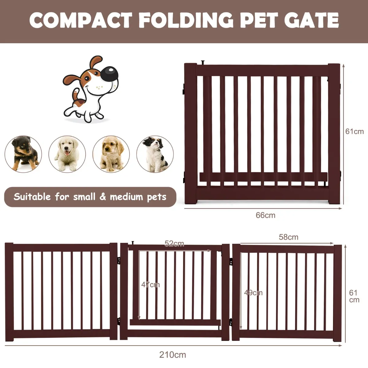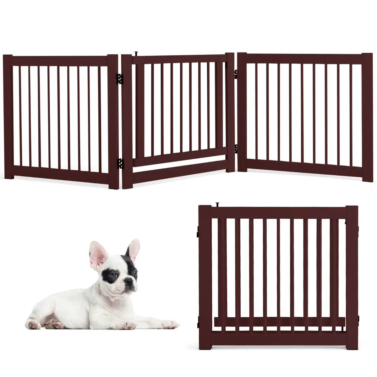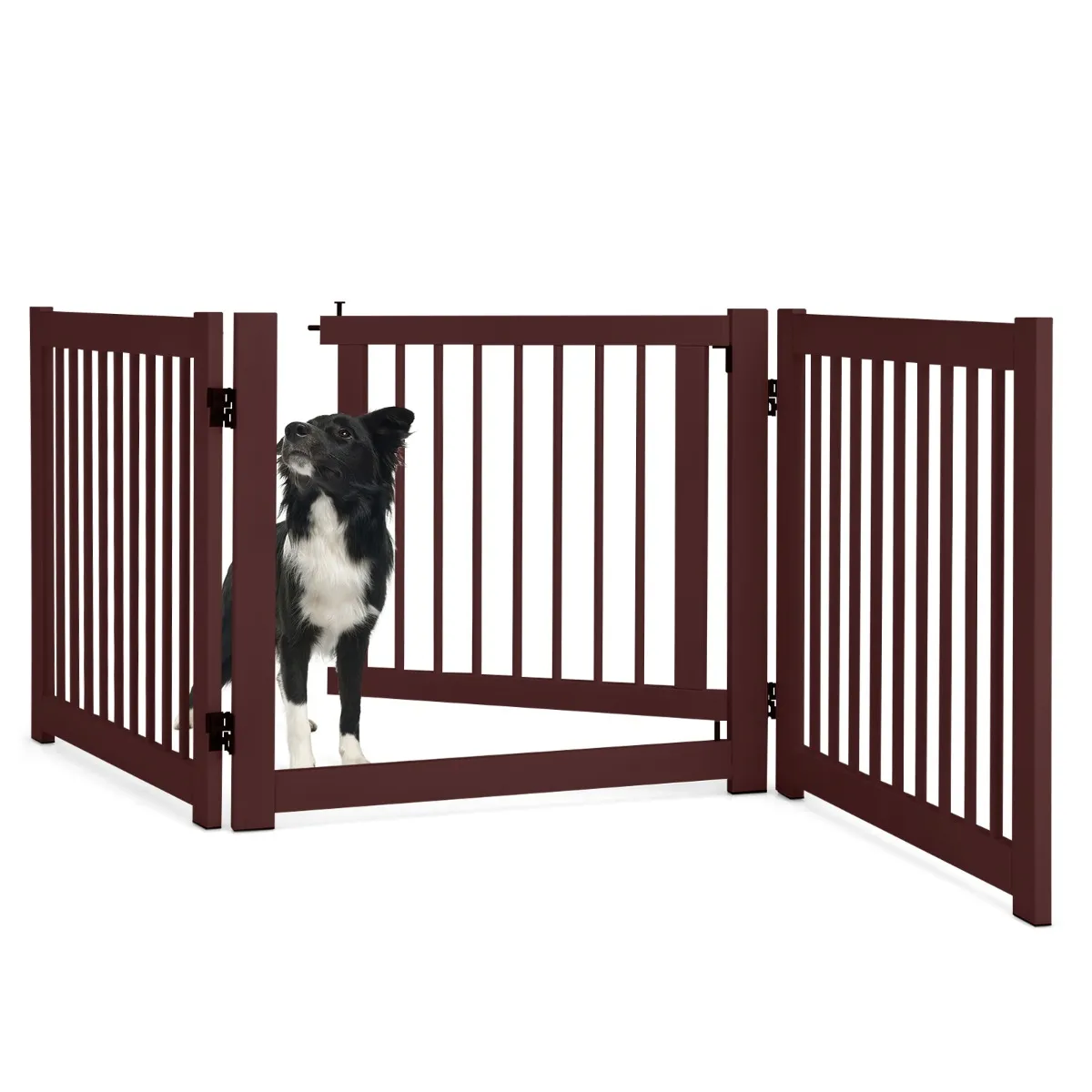 Ons huisdierhek bestaat uit drie panelen, die elk 360 graden kunnen draaien, zodat u het kunt aanpassen aan verschillende vormen volgens uw behoeften, geschikt voor trappen, deuropeningen, gangen en andere gevaarlijke gebieden om een veilig gebied voor uw huisdier te creëren. En het hek kan gemakkelijk worden opgevouwen om ruimte te besparen wanneer het niet wordt gebruikt. Bovendien is het hek voorzien van een afsluitbare deur waardoor huisdieren er doorheen kunnen lopen zonder het hele hek te hoeven verplaatsen. Het hek heeft anti-slip doppen aan de onderkant en elk paneel is beveiligd door sterke scharnieren, dus het is stabiel en kan vrij staan. Ons hondenhek is gemaakt van hoge kwaliteit grenenhout voor langdurig gebruik. Bovendien is het huisdierenhek bij aankomst voorgemonteerd, zodat u zich geen zorgen hoeft te maken over de montage.