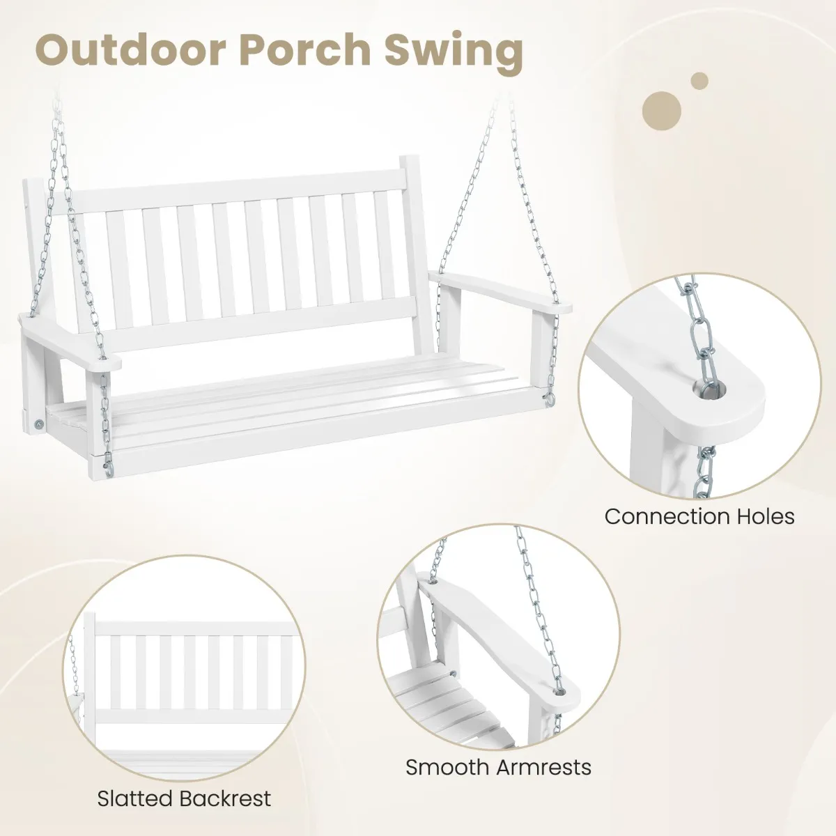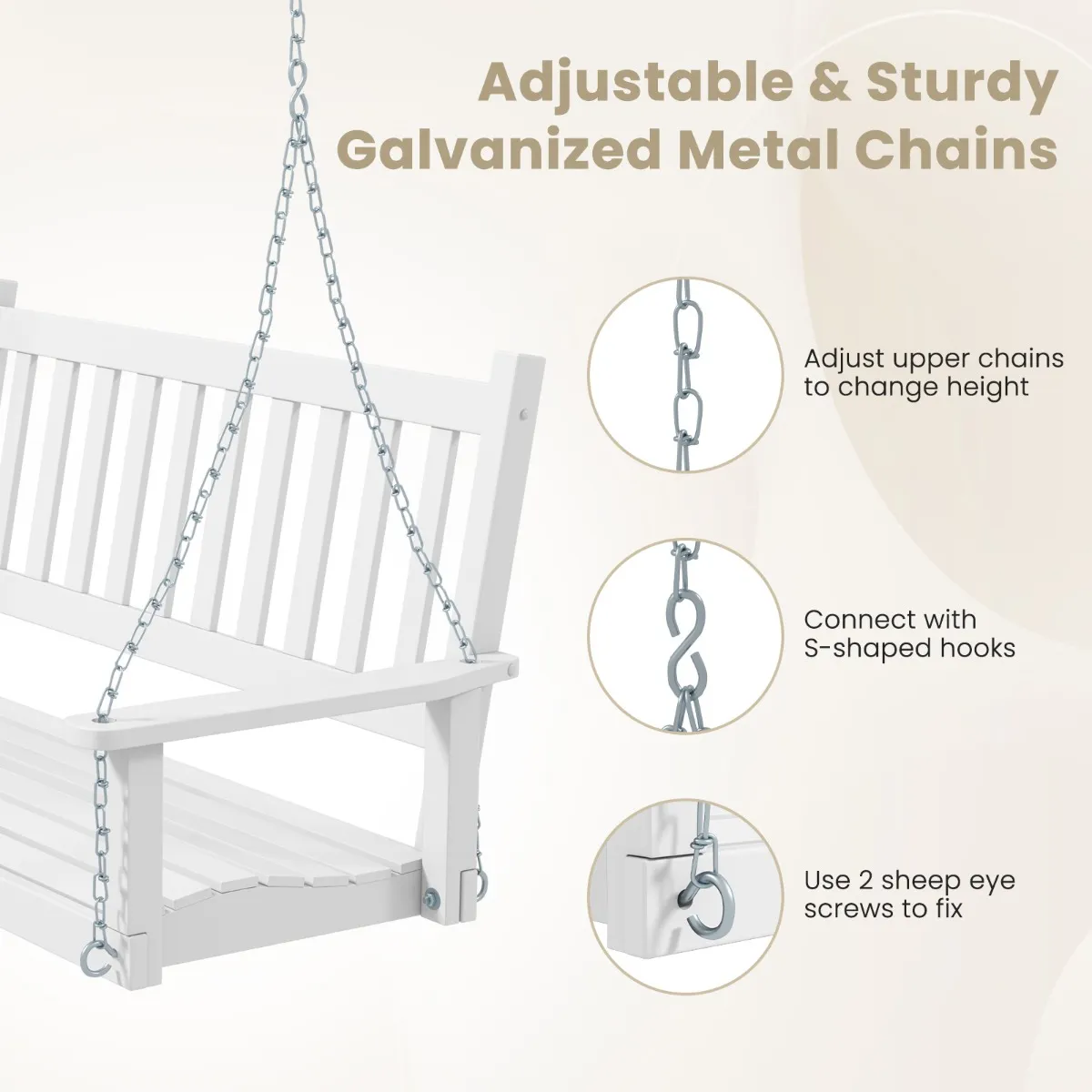 Verstelbare Metalen Kettingen:Â Er zijn 2 roestvrijstalen metalen kettingen om de veranda schommel op te hangen. U kunt de bovenste kettingen verstellen om de hoogte aan te passen, verbinden met S-haken en bevestigen met 2 schroefhaken. De lengte van de bovenste stalen kettingen is 170 cm.