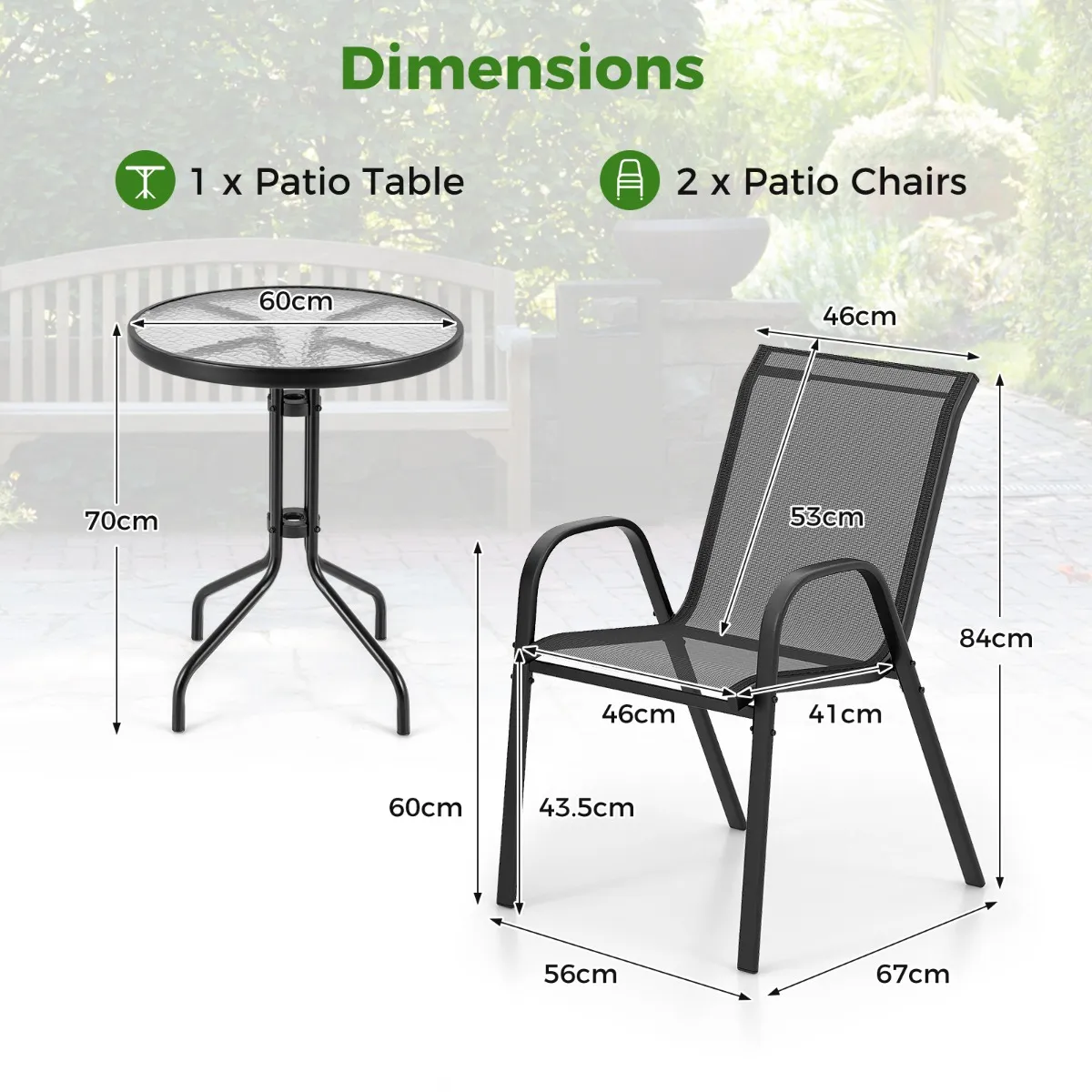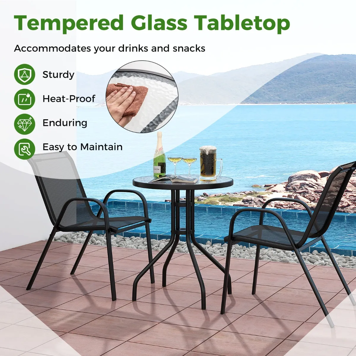 De stevige metalen frames en het elegante blad van gehard glas bieden duurzaamheid en eenvoudig onderhoud. Deze conversatiemeubelset bevat stapelbare stoelen voor ruimtebesparende opslag en kan tot 150 kg per stoel en 50 kg op tafel dragen. Deze veelzijdige bistroset is perfect voor buitenruimtes zoals tuinen, balkons of zwembaden en is eenvoudig te monteren met duidelijke instructies.