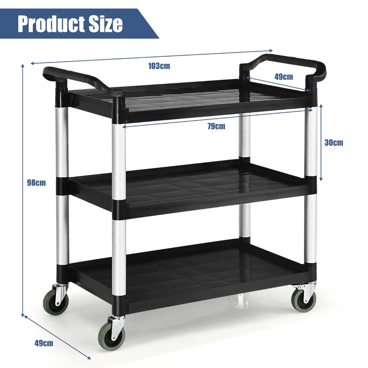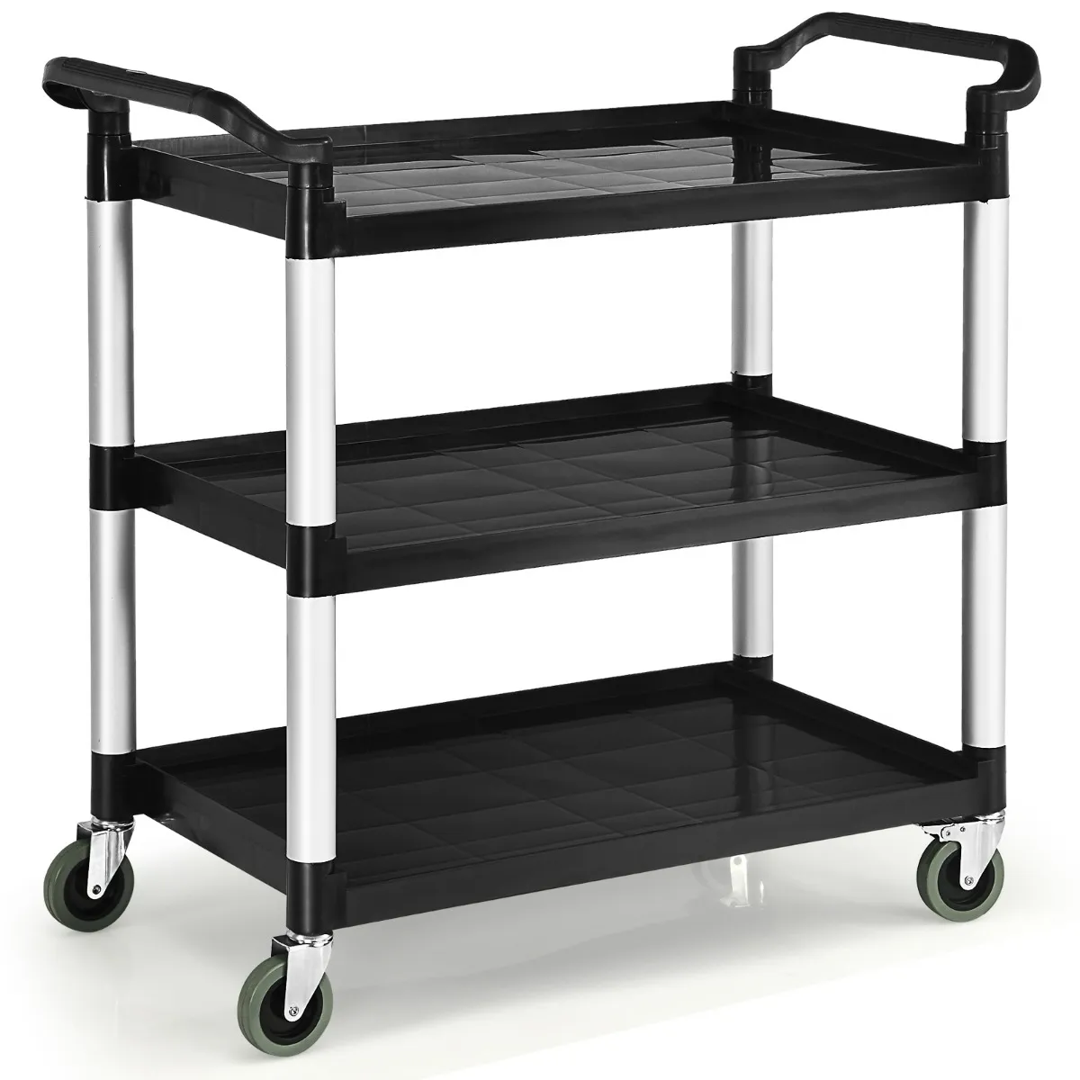 Deze multifunctionele trolley met 3 niveaus speelt een goede rol bij het vervoer in kantoren, restaurants, hotels, fabrieken, huizen, picknicks buitenshuis en nog veel meer. Het ontwerp met 3 niveaus geeft je niet alleen genoeg ruimte om je benodigdheden op te bergen, maar ook om ze per categorie te sorteren. 4 soepele wielen en menselijke handgrepen maken het transport gemakkelijker en handiger. Als je de servicewagen op zijn plaats wilt houden, kan het remsysteem aan de onderkant helpen om dit effect te bereiken. Het PP-materiaal en de aluminium buizen zijn stevig en duurzaam, terwijl ze toch licht blijven. Het waterdichte en gladde oppervlak maakt schoonmaken moeiteloos.