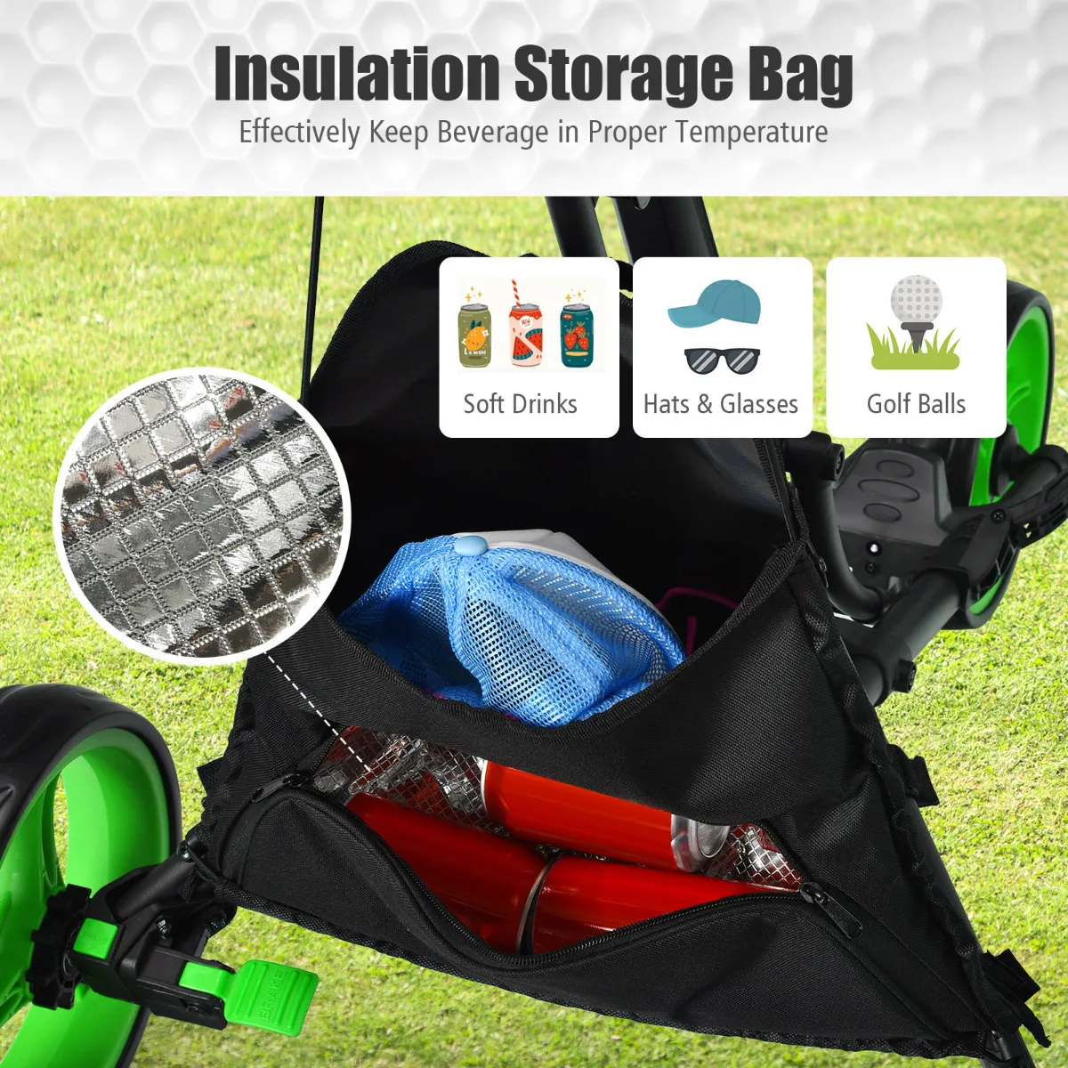 【Voldoende opbergruimte】: De functionele golftrolley beschikt over verstelbare paraplubak die de paraplu kan ondersteunen om schadelijke stralen & regendruppels te vermijden. De grote capaciteit opbergzak heeft twee lagen, de binnenste zak kan worden gebruikt om golfuitrusting te plaatsen, en de buitenste zak met reflecterende tin folie coating kan houden koude of warme dranken die moeten worden geïsoleerd of waterdicht gemaakt.