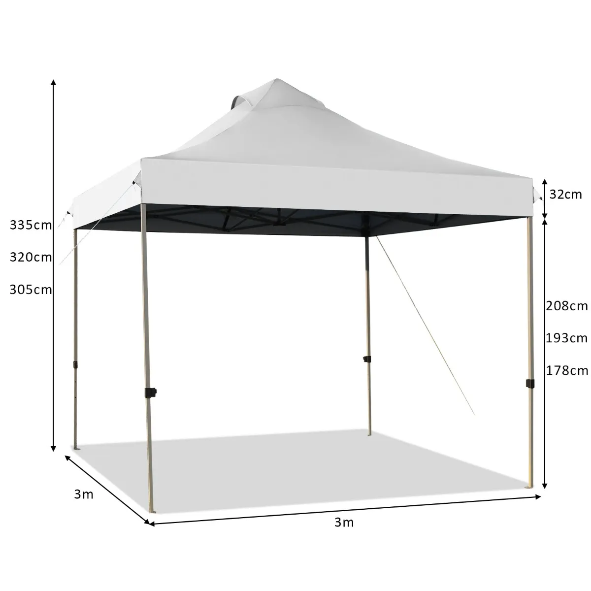 Ons opvouwbare prieel is gemaakt van zilver gecoat Oxford doek, om je te beschermen tegen zon en regen. Het gepoedercoate metalen frame is robuust en roestvrij voor langdurig gebruik. Met een schaduwoppervlak van 9 m² is het perfect voor picknicks, feestjes, beurzen en andere buitenactiviteiten. Hij heeft 3 verstelbare hoogtes met anti-knijpknoppen zodat je de poten gemakkelijk kunt vergrendelen zonder je vingers af te knellen. Bovendien wordt hij geleverd met een opbergtas op wieltjes zodat je hem kunt meenemen naar het strand of het park.