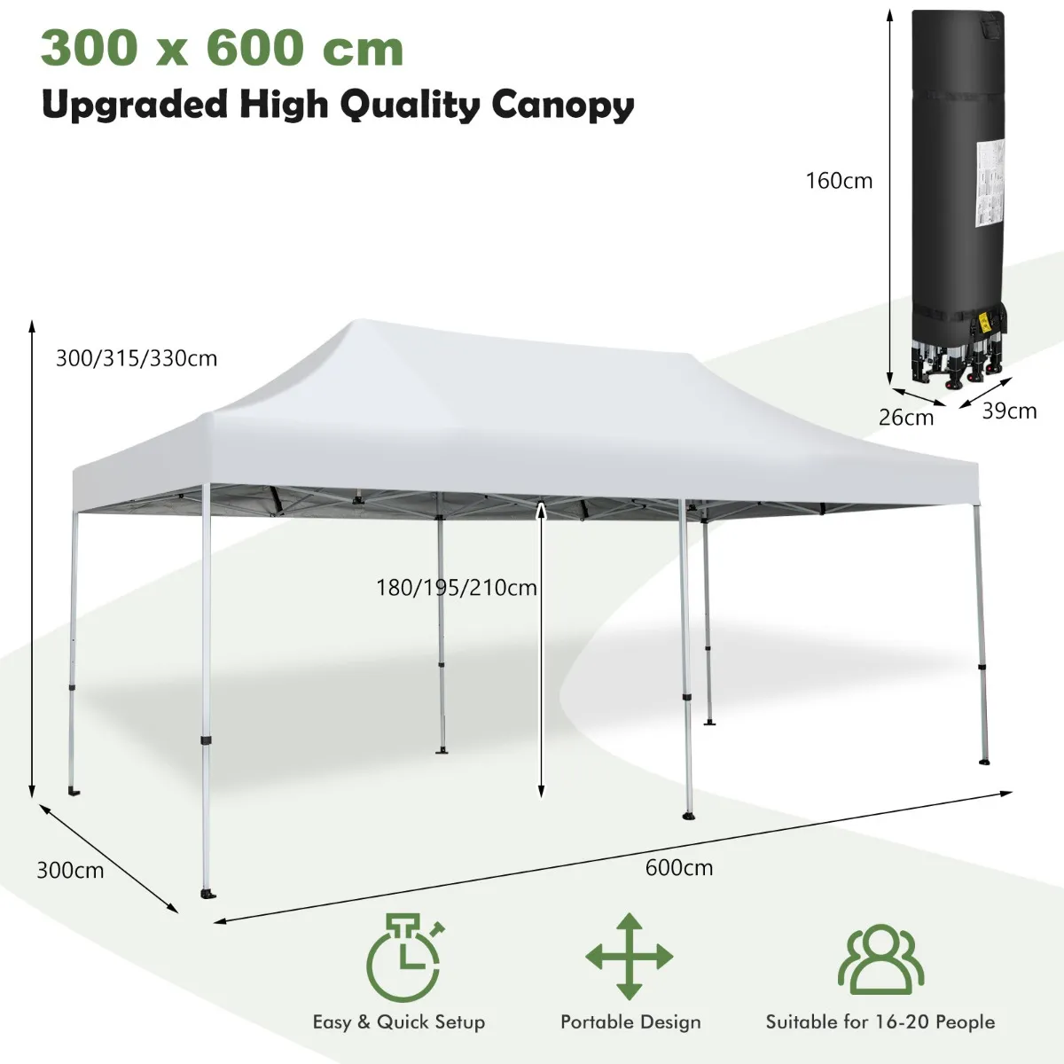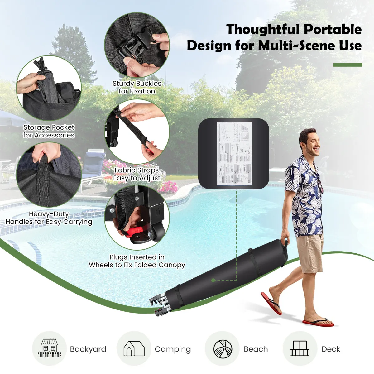 Het vooraf geïnstalleerde metalen frame is vrij sterk voor stabiel gebruik, terwijl het ook een montage zonder gereedschap biedt, die door 2 personen kan worden voltooid. Zolang je met één hand op de knoopnaaf drukt, de bovenste kap met klittenbandsluitingen afdekt en bevestigt, is een vouwpaviljoen klaar voor gebruik. Afhankelijk van de individuele behoeften kan het paviljoen in 3 hoogtes worden versteld, 300/315/330 cm, 16-20 personen kunnen de gegeven schaduw samen delen. Buiten kun je de aangeboden metalen palen en touwen voor extra bevestiging gebruiken. De draagtas zorgt voor een mobiel design op wielen.
