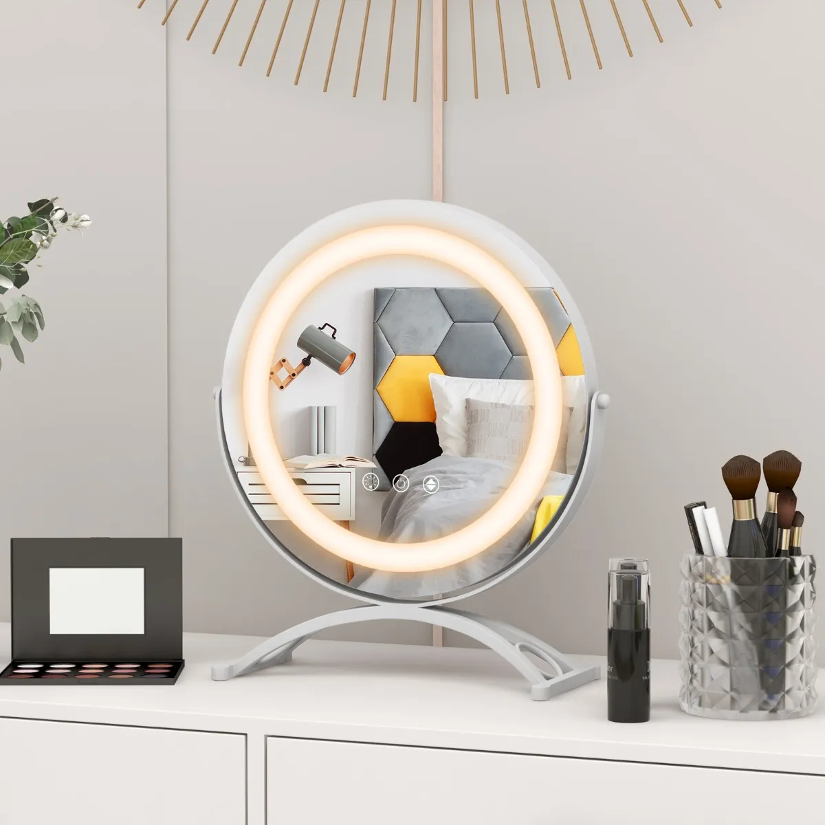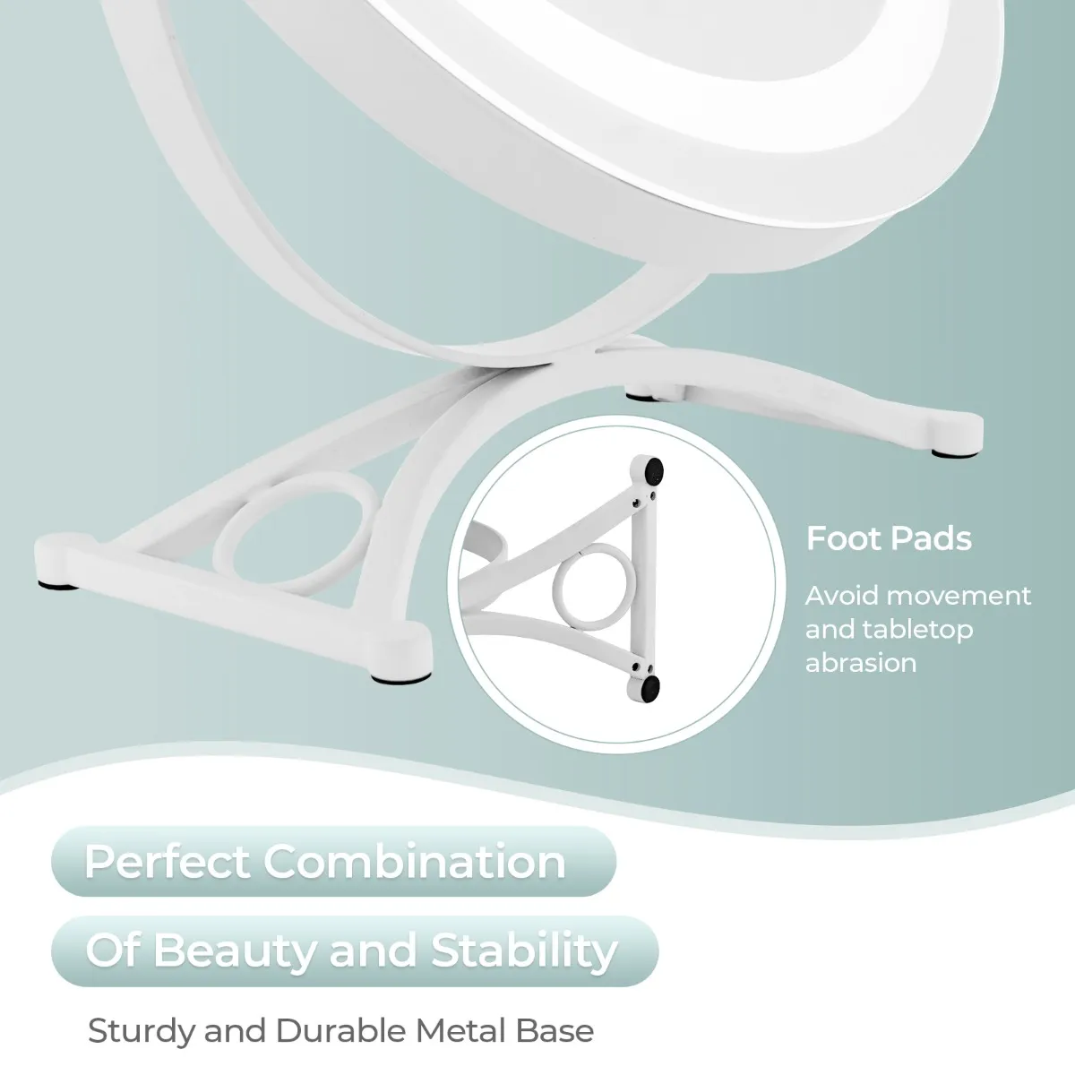 De perfecte combinatie van schoonheid en stabiliteit: Onze elegante make-upspiegel voegt een vleugje verfijning toe aan elke ruimte. De stevige, duurzame metalen voet is voorzien van voetsteunen om beweging en krassen op de tafel te voorkomen.