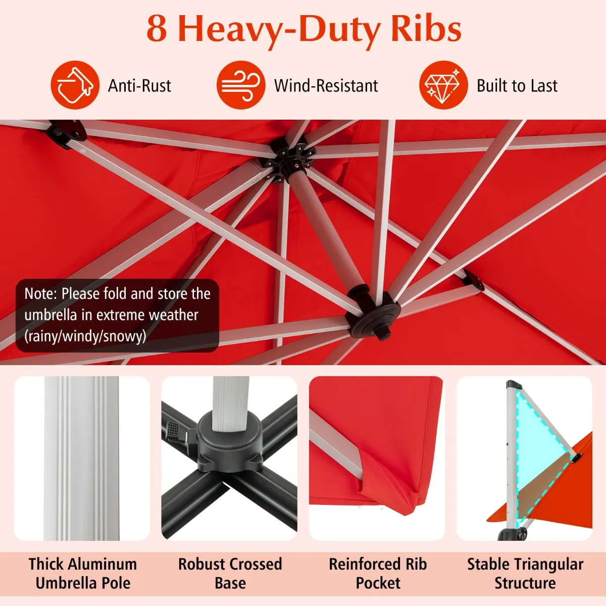 8 baleinen zorgen voor een sterke ondersteuning zodat de Parasolgemakkelijk open en dicht kan