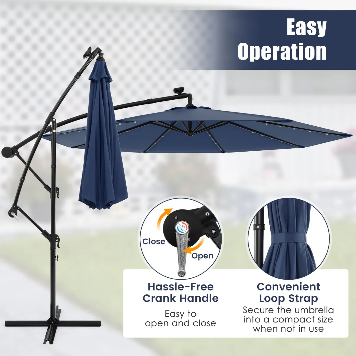 Onze op zonne-energie werkende hangparasol meet 300 x 250 cm en biedt royale 7 m² schaduw, wat voldoende bescherming tegen zonlicht garandeert. De kantelhoek kan eenvoudig worden ingesteld met behulp van de vergrendelingsgreep, zodat de parasol de zon vanuit verschillende richtingen kan blokkeren en altijd een koele schaduwplek creëert. Het belangrijkste is dat hij is uitgerust met 40 lampen en een energiezuinig zonnepaneel, zodat u uw avonden buiten kunt doorbrengen in een warme en uitnodigende omgeving. Bovendien is het dak gemaakt van hoogwaardig polyester dat bestand is tegen lichte regen, zonneschijn en isolatie biedt, waardoor het betere bescherming biedt buitenshuis. Met 8 robuuste metalen ribben en een stevige metalen paal weerstaat hij winderige omstandigheden. Dankzij de praktische draaigreep kan het scherm eenvoudig worden geopend en gesloten door aan de greep te draaien. Deze parasol is perfect voor verschillende buitenruimtes, of het nu uw terras, tuin, zwembadgebied of een andere buitenruimte is die u wilt verfraaien. Opmerking: We raden aan om een verzwaarde voet (niet inbegrepen) te gebruiken om het scherm te bevestigen en zo de windbestendigheid te verbeteren.