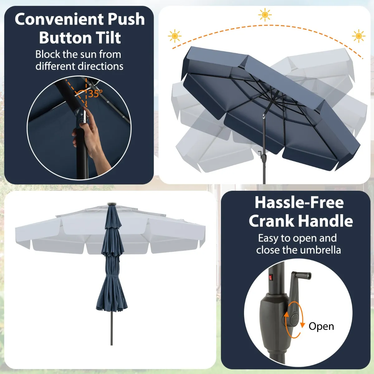 【Automatisch kantelbaar ontwerp en bediening met zwengel】: Met een handige kantelknop kan het doek eenvoudig tot 35° in elke richting worden gekanteld voor optimale schaduw. De probleemloze bediening met zwengel maakt het openen en sluiten van de parasol eenvoudig.