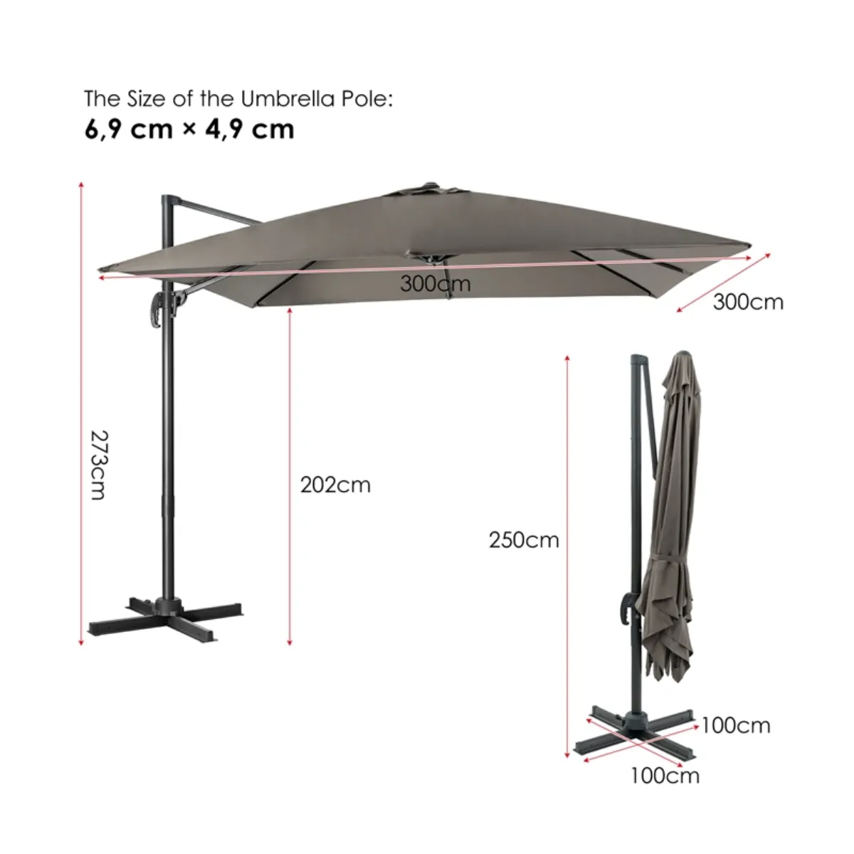 【Grote schaduwzone en overal bruikbaar】: Met zijn afmetingen van 300 x 300 x 273 cm (L x B x H) biedt de rechthoekige terrasparasol een grote schaduwzone, wat essentieel is voor zomers of zonnige dagen om de zon in de schaduw te zetten. Bovendien is hij ook perfect om je tuinmeubelset in de schaduw te zetten. De grote offset parasol is ideaal voor de tuin, patio, terras, café, terras, gazon of andere activiteitengebieden.