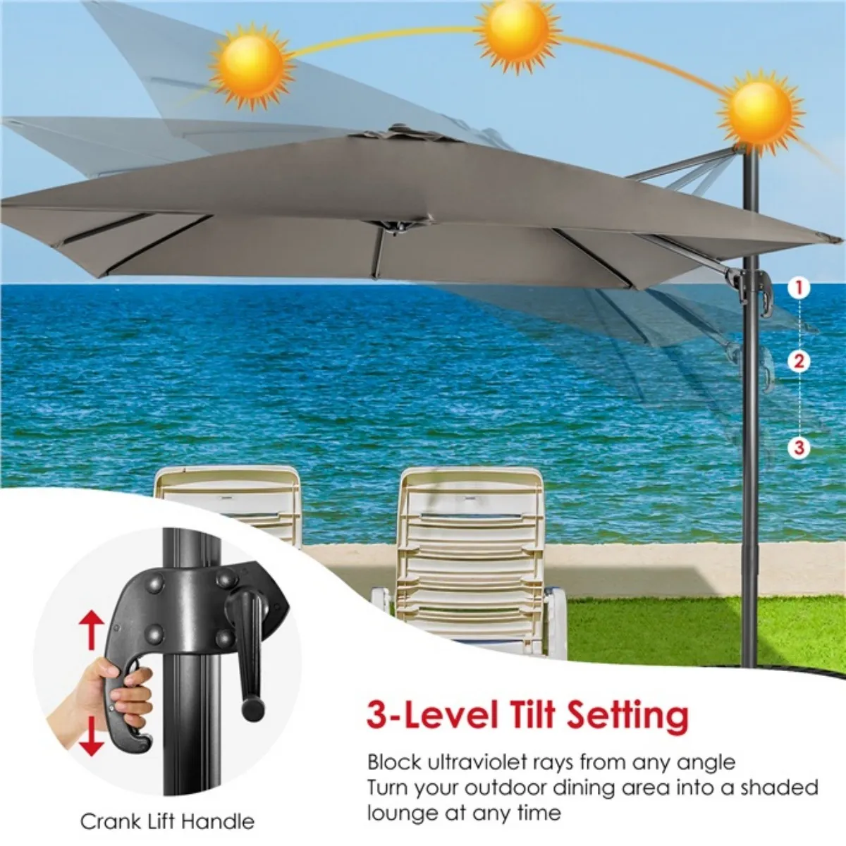 Onze rechthoekige terrasparasol is ontworpen met een parasoldoek van 300cm x 300cm, wat een groter gebied van schaduw en bescherming tegen de zon biedt, zodat jij en je familie kunnen genieten van een koel en comfortabel buitenfeestje of thee. De stof is gemaakt van UV-bestendig polyester van hoge kwaliteit, dat ook kleur- en waterbestendig is en dus lang meegaat. Bovendien helpen de ventilatieopeningen aan de bovenkant de luchtcirculatie en warmteafvoer te bevorderen. Dankzij 8 sterke baleinen en een verdikte parasolstok is de offset parasol stabiel en stevig, en de structuur is gemaakt van versterkt staal dat effectief roestbestendig is. Dankzij het unieke ontwerp van de hendel en het zwenksysteem kunnen de hoeken van de parasol in 3 standen worden versteld en kun je de parasol eenvoudig openen of sluiten. Bovendien kan de parasol flexibel 360° draaien en in 8 posities worden vastgezet, zodat je de ideale positie kunt vinden voor meer schaduw.