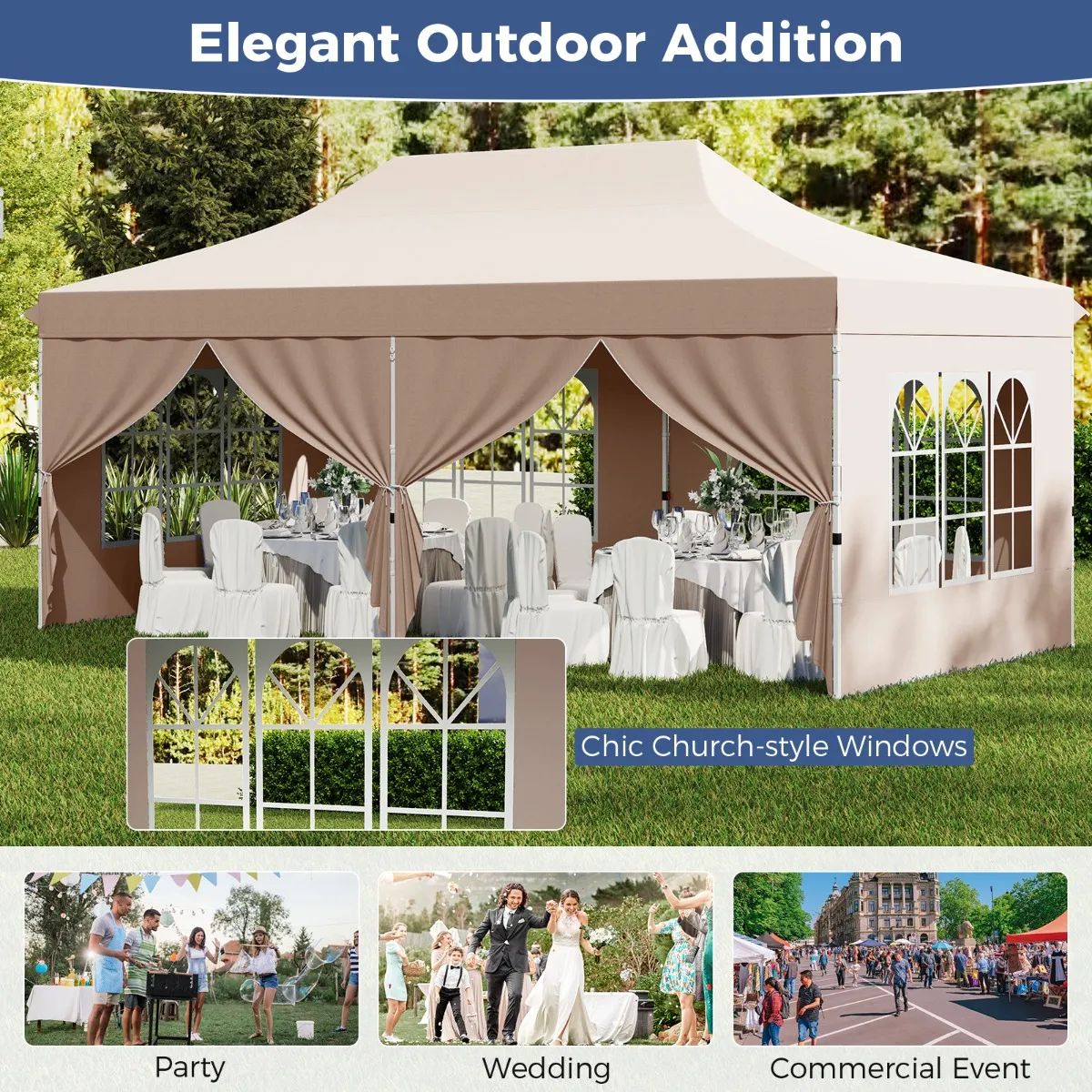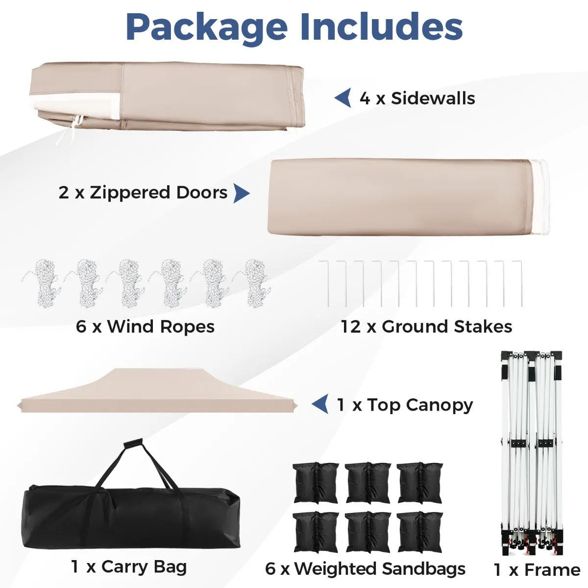 6 afneembare zijwanden: De tent wordt geleverd met 6 afneembare zijwanden (2 met ritssluiting en 4 met transparante ramen), die eenvoudig bevestigd worden met klittenband. Of je nu privacy wilt, beschutting tegen wind of een gezellige sfeer wilt creëren – deze wanden bieden de flexibiliteit die je nodig hebt.