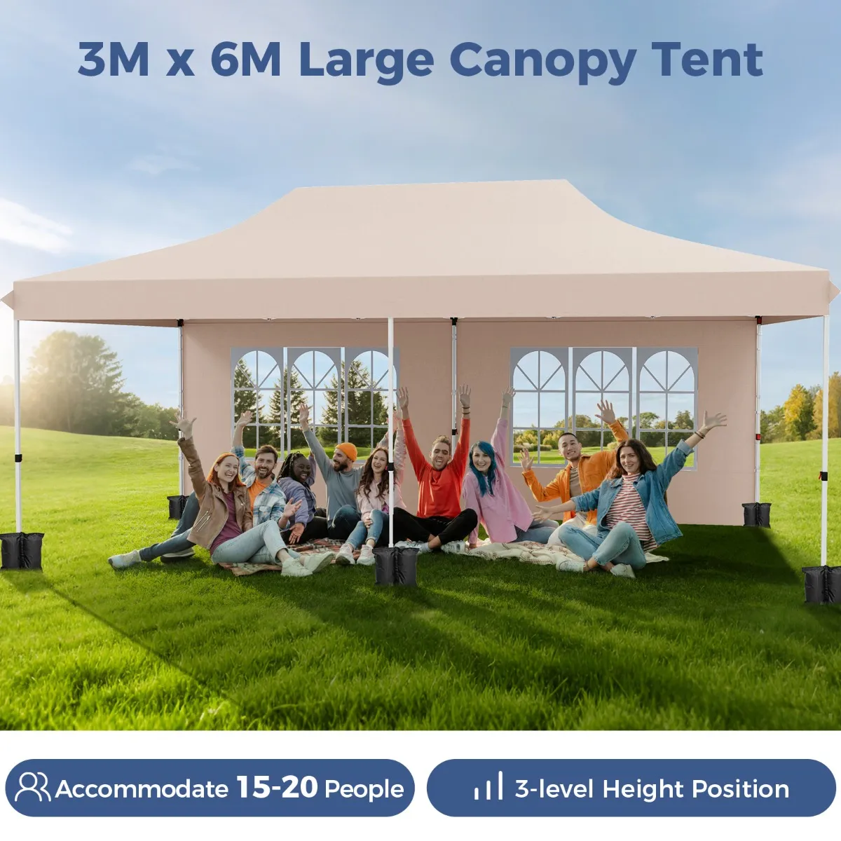 Stevig en stabiel ontwerp: Deze pop-up partytent van 300 x 600 cm wordt ondersteund door een roestbestendig, gepoedercoat metalen frame dat zorgt voor uitstekende stabiliteit en duurzaamheid. Dankzij windbestendige scheerlijnen, metalen grondpennen en stevige voetplaten staat de tent ook bij winderig weer stevig.