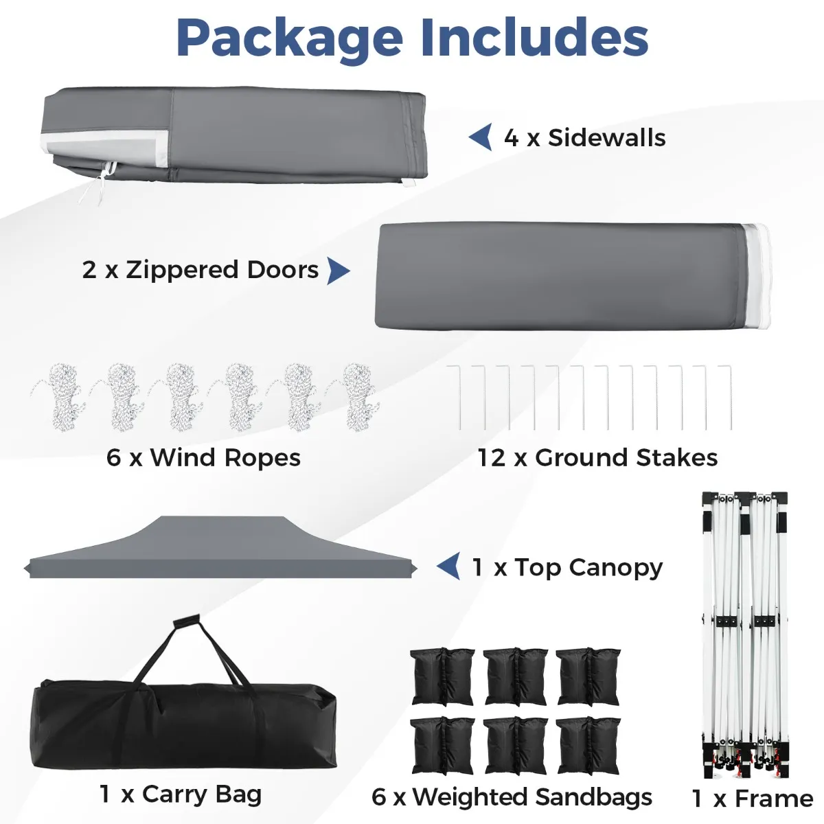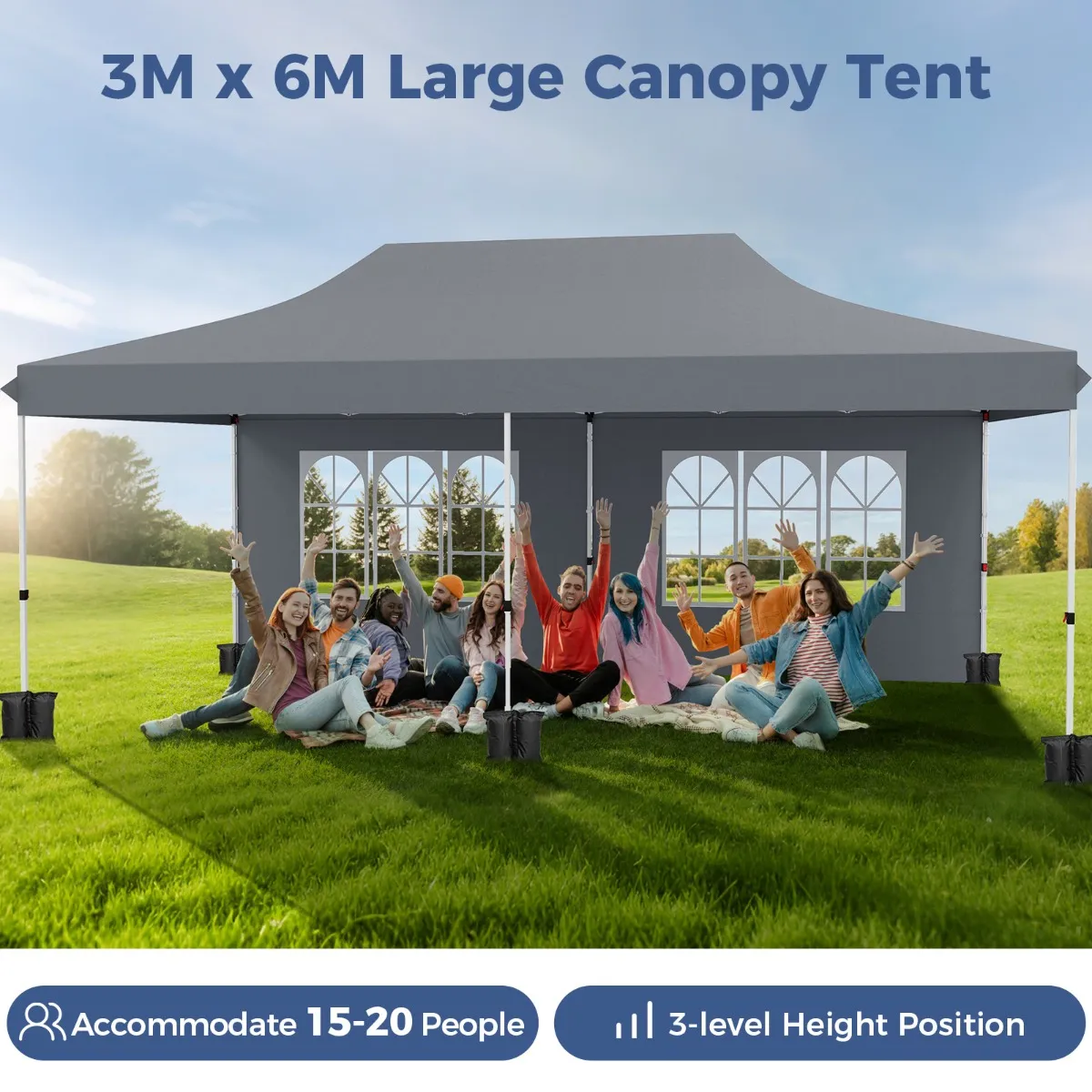Stevig en stabiel ontwerp: Deze pop-up partytent van 300 x 600 cm wordt ondersteund door een roestbestendig, gepoedercoat metalen frame dat zorgt voor uitstekende stabiliteit en duurzaamheid. Dankzij windbestendige scheerlijnen, metalen grondpennen en stevige voetplaten staat de tent ook bij winderig weer stevig.