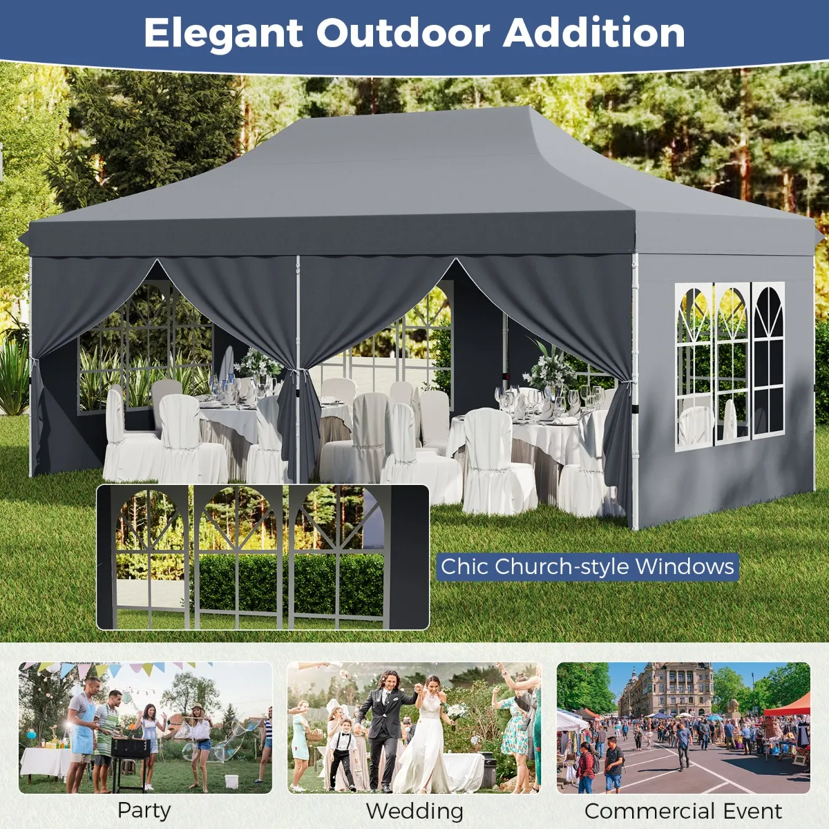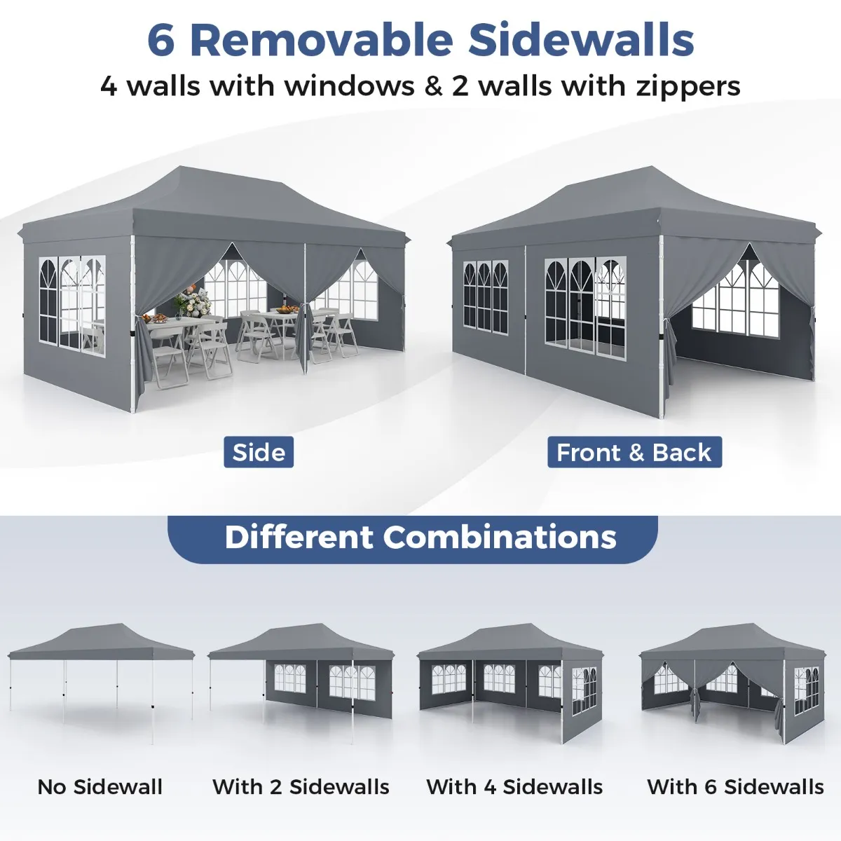 6 afneembare zijwanden: De tent wordt geleverd met 6 afneembare zijwanden (2 met ritssluiting en 4 met transparante ramen), die eenvoudig bevestigd worden met klittenband. Of je nu privacy wilt, beschutting tegen wind of een gezellige sfeer wilt creëren – deze wanden bieden de flexibiliteit die je nodig hebt.