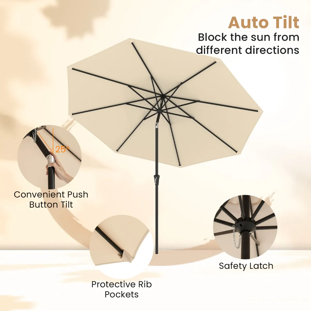 Handige kantelfunctie met drukknop: De parasol beschikt over een automatisch kantelmechanisme waarmee je het scherm tot 25° naar links of rechts kunt verstellen. Zo kun je altijd genieten van koele schaduw, ongeacht de stand van de zon. De bediening is eenvoudig met één druk op de knop.