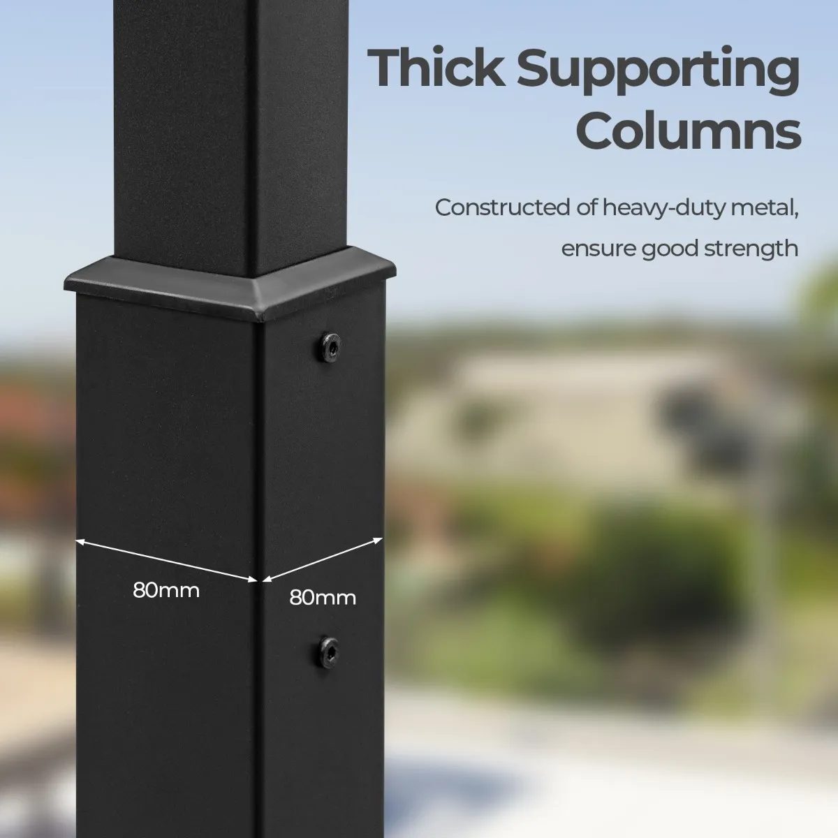Betrouwbare constructie:Â Ondersteund door dikke pilaren van 80 x 80 mm (L x B), biedt het terraspaviljoen een solide en betrouwbare basis voor de hele structuur. Bovendien is hij gemaakt van stevig metaal en biedt hij uitzonderlijke duurzaamheid voor langdurig gebruik buitenshuis.