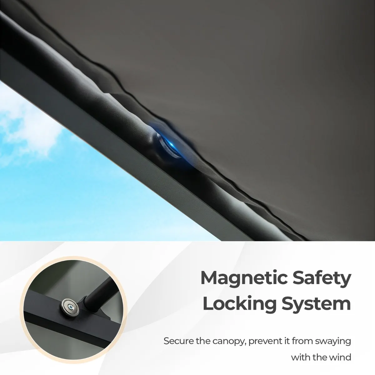 Weerbestendige luifelstof:Â De luifel is gemaakt van hoogwaardig polyesterweefsel, dat zonwerend, spatwaterdicht, lichtbestendig en scheurbestendig is en een betere bescherming biedt bij buitenactiviteiten. Bovendien heeft het een vlamvertragende behandeling die veiligheid en duurzaamheid garandeert.