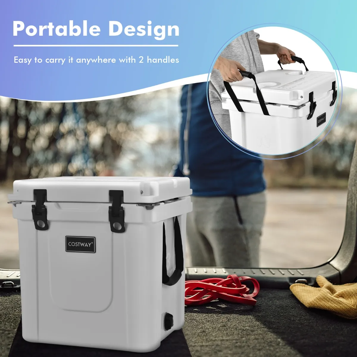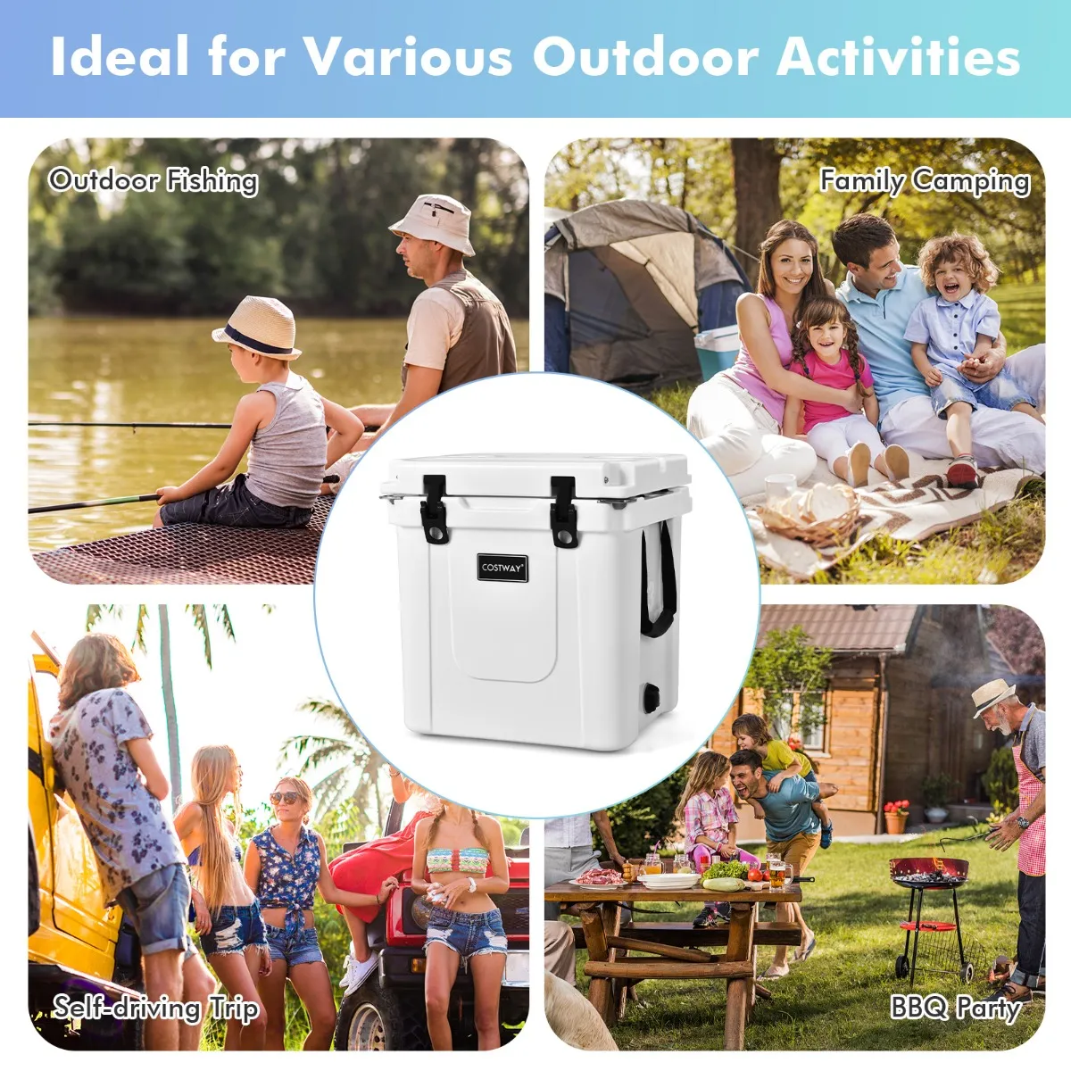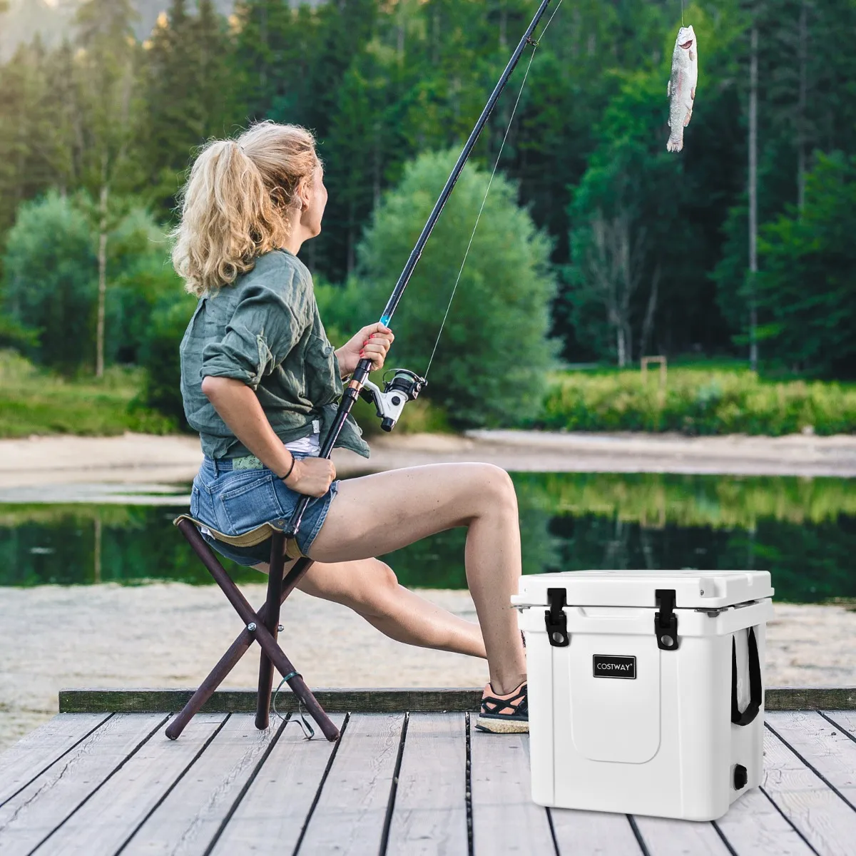Dankzij de onverwoestbare roto molded constructie en superieure isolatieprestaties, is deze zware koeler een perfecte partner voor alle buitenactiviteiten, zoals BBQ-feesten, picknick, vissen, kamperen of zelf rijden op reis. Het kan uw drankjes, voedsel en fruit koud houden voor 7-9 dagen. De bovenkant van onze ijskist is bestand tegen meer dan 200kg, zodat u zonder zorgen op het deksel kunt zitten. Een verwijderbare verdeler, opbergmand en bekerhouder zijn voorzien voor een betere gebruikservaring. Bovendien heeft deze koelbox met een grote inhoud van 31 liter 2 verzonken bekerhouders, visliniaal, veiligheidssloten, 2 roestvrijstalen flesopeners, lekvrije aftapplug, 2 draaggrepen en anti-slip voetkussentjes. Al deze doordachte details maken het een perfecte koelbox.