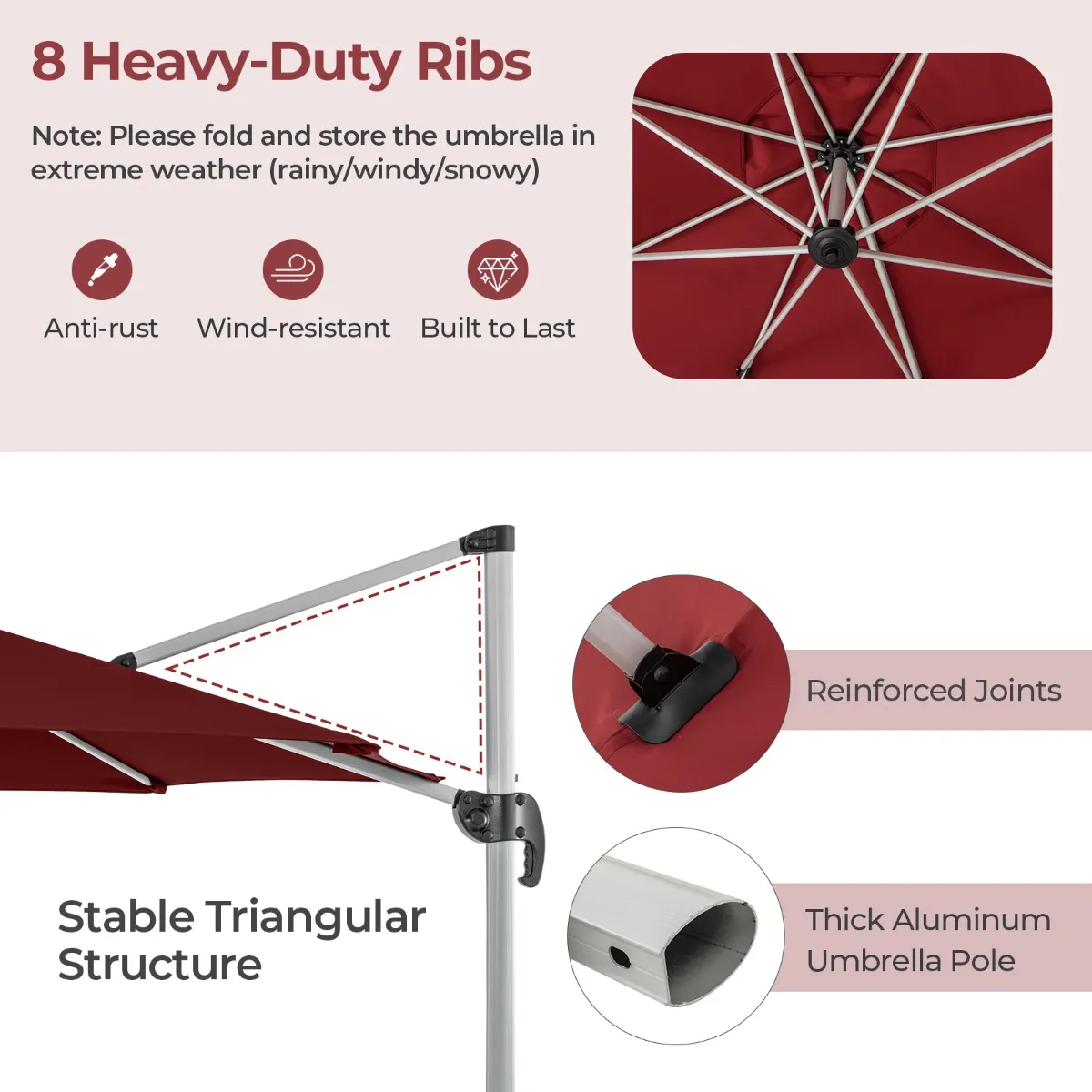 【Stevige, stabiele constructie】: De parasol wordt ondersteund door een dikke aluminium parasolstok en 8 stevige baleinen. En het oppervlak van het metalen frame is gecoat met roestwerende verf, voor langdurig buitengebruik. Bovendien heeft de top een verstevigde driehoekige structuur om de parasol te stabiliseren in winderige omstandigheden.