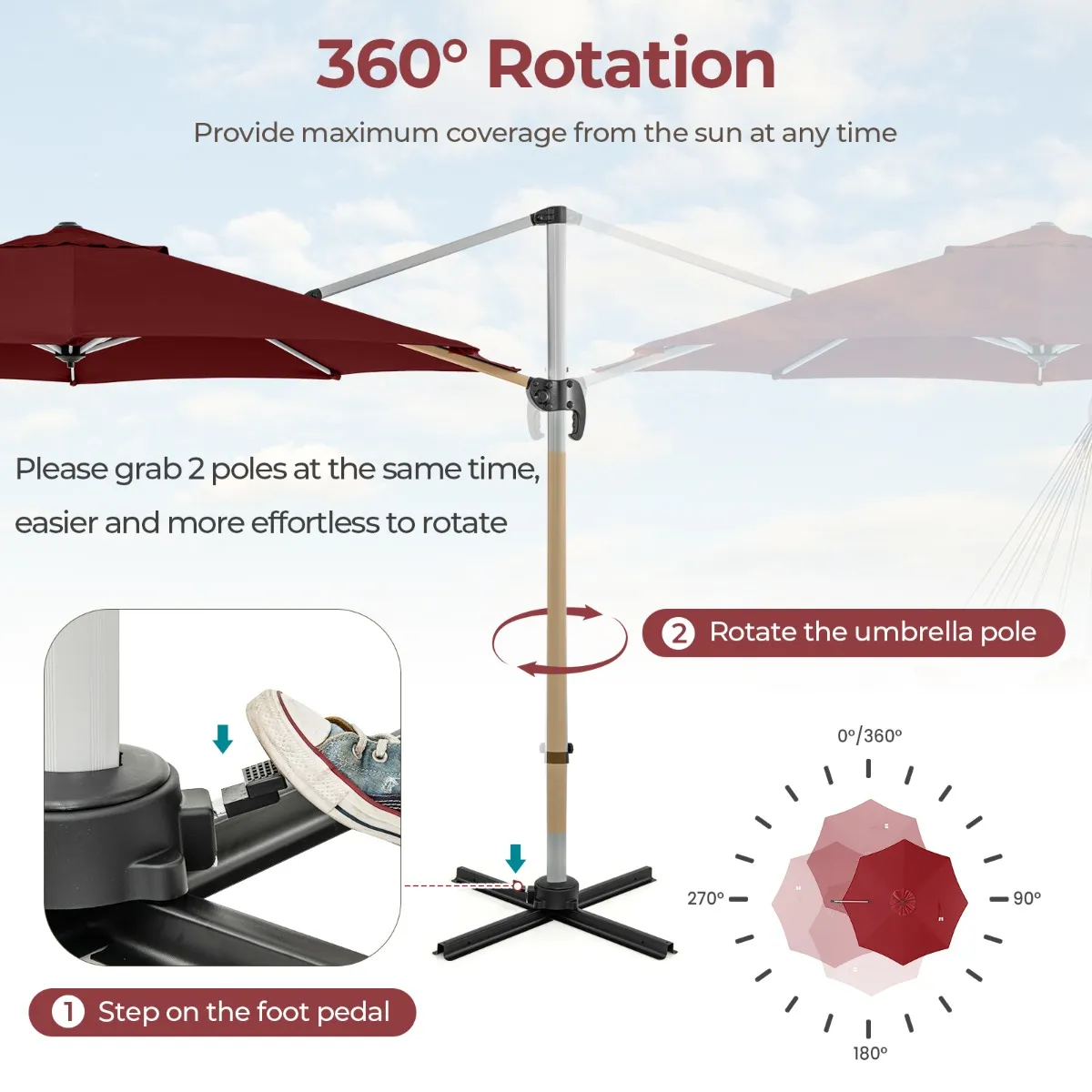 Eenvoudig te draaien door het voetpedaal in te drukken en de zonneschermstok te draaien