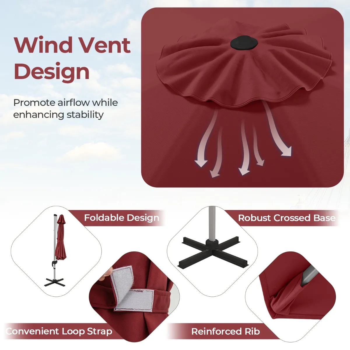 【Dubbel evenementontwerp】: De grote buitenparasol heeft een geventileerd ontwerp aan de bovenkant, waardoor de luchtcirculatie wordt bevorderd voor een comfortabelere buitenervaring, terwijl de stabiliteit in winderige omstandigheden wordt verbeterd.