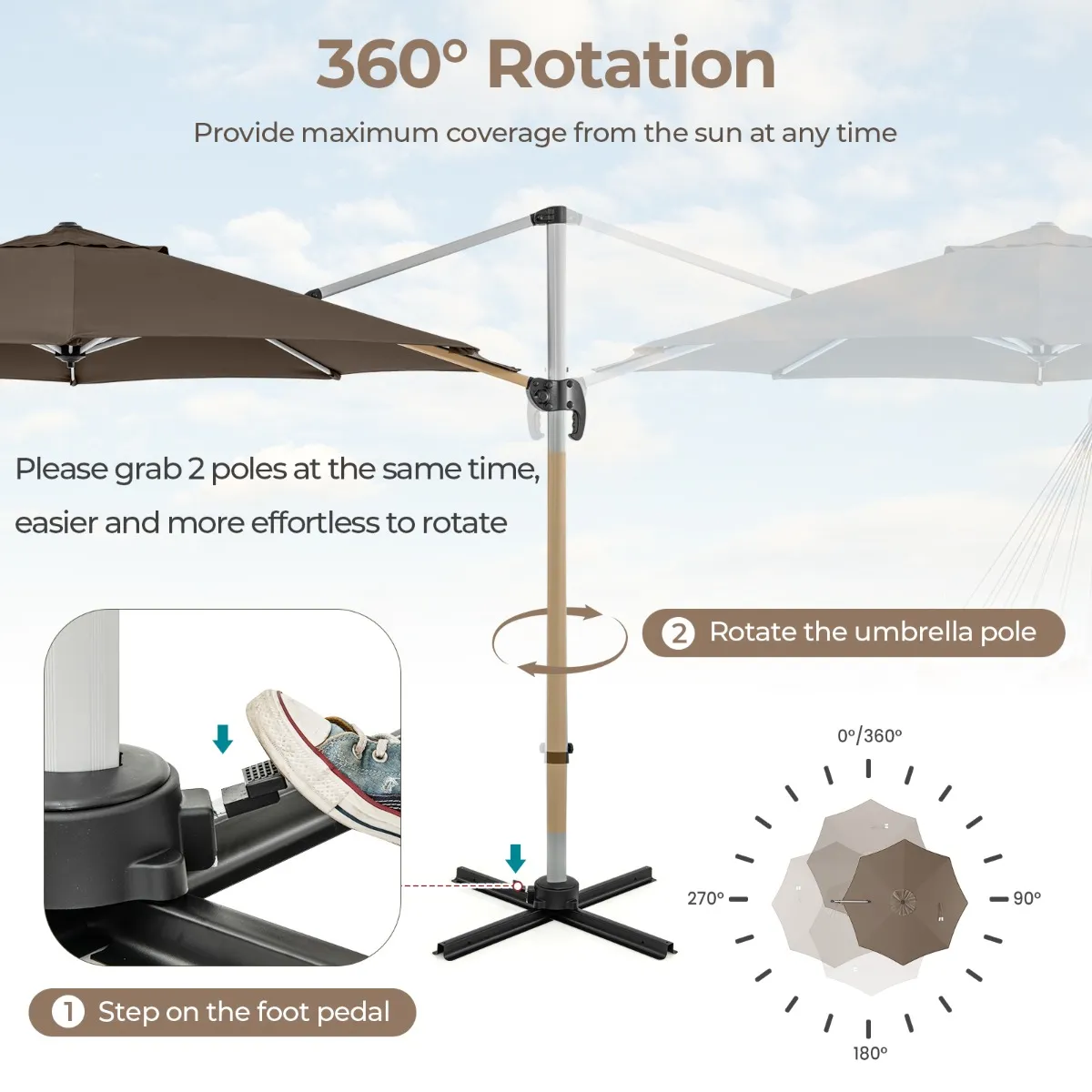 360° rotatie en verstelbare kanteling: Deze vrijdragende parasol is uitgerust met een handig voetpedaal dat een naadloze rotatie van 360° mogelijk maakt. En er zijn 5 verstelbare kantelhoeken die eenvoudig kunnen worden aangepast door de slinger op en neer te bewegen. Dit betekent dat het gearceerde gebied individueel kan worden aangepast.