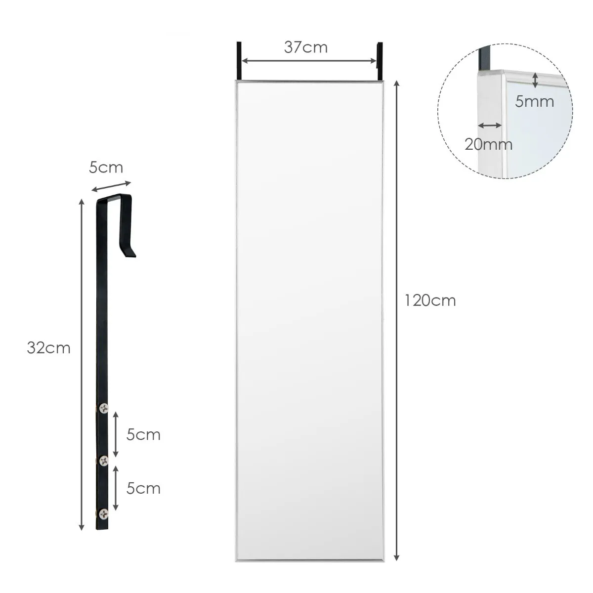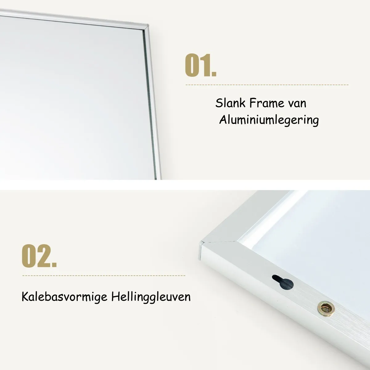 De spiegel biedt u 2 ophangmogelijkheden. De ene is om de spiegel aan de muur te hangen met de bijgeleverde uitbreidingsschroeven. De andere is om de spiegel boven de deur te hangen met de bijgeleverde haken. Beide methodes zijn handig en stevig genoeg. Bovendien zijn de ophanghaken voorzien van 6 voorgeboorde gaten, zodat u de spiegel in verschillende posities kunt ophangen om de kijkhoogte aan te passen. Bovendien is de spiegel veilig met duurzaam met een frame van zware aluminiumlegering. Het zal perfect zijn voor de slaapkamer, woonkamer en de ingang.
