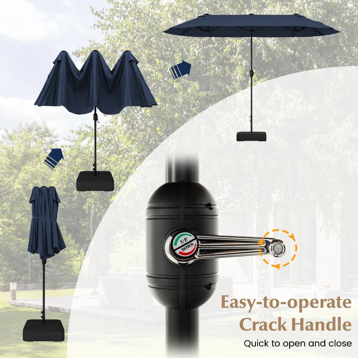 【Gemakkelijk te gebruiken en in te klappen】 De dubbele parasol is uitgerust met een eenvoudig te bedienen zwengel en kan met gemak volledig worden geopend. En er is een veiligheidsslot om de parasol open te houden. Dankzij een bevestigingsband kan de grote parasol eenvoudig worden ingeklapt en opgeborgen als hij niet wordt gebruikt.