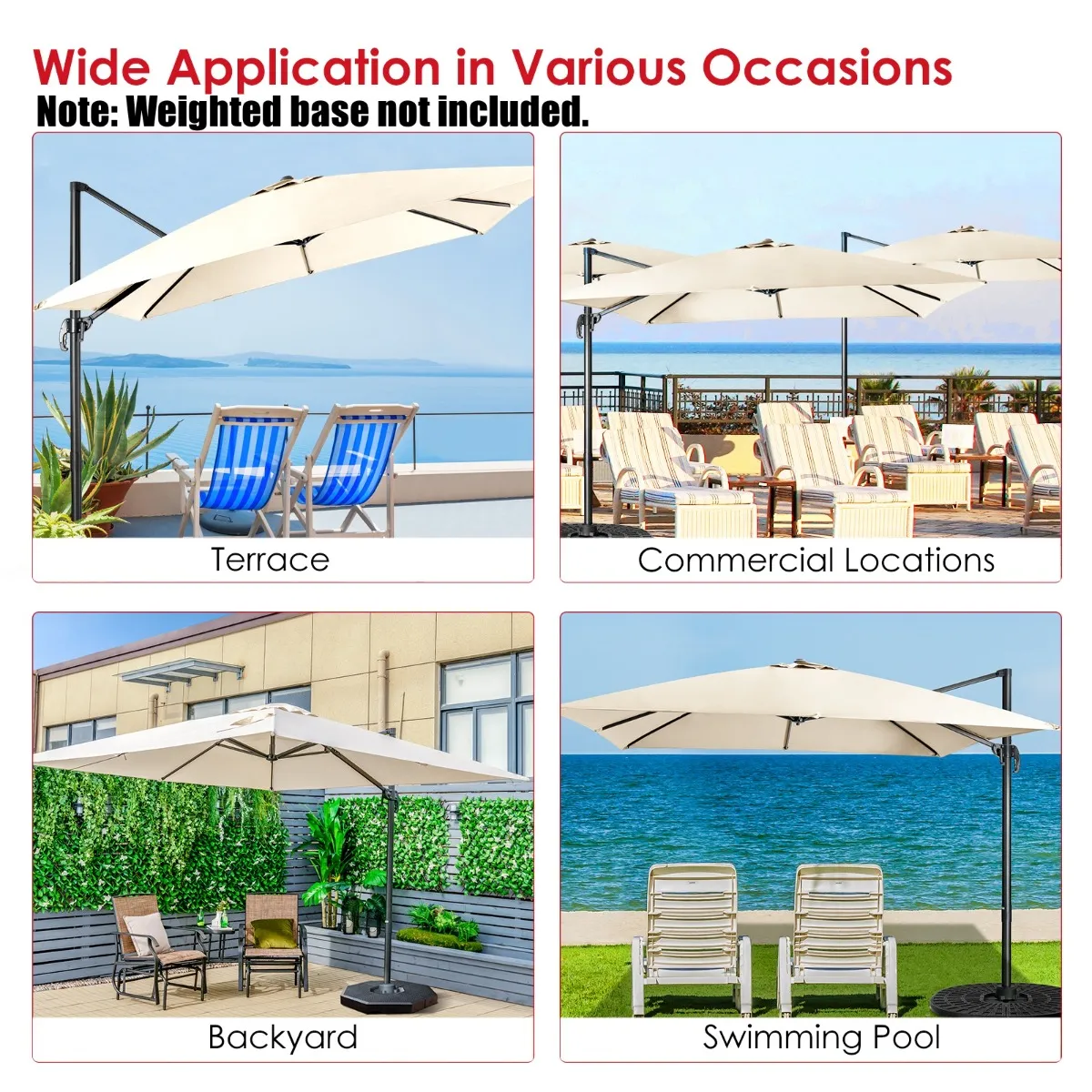 Groot schaduwoppervlak & Brede toepassingen: Het meten van 300 x 300 x 273 cm (L x B x H), verstrekt de rechthoekige terrasparasol een groot schaduwgebied, dat voor zomers of zonnige dagen essentieel is om zonneschijn te beschaduwen. Bovendien kan het ook perfect schaduw geven aan uw buiten meubelset. De grote cantilever parasol is ideaal voor de tuin, patio, terras, cafe, dek, gazon, of andere activiteit locaties.