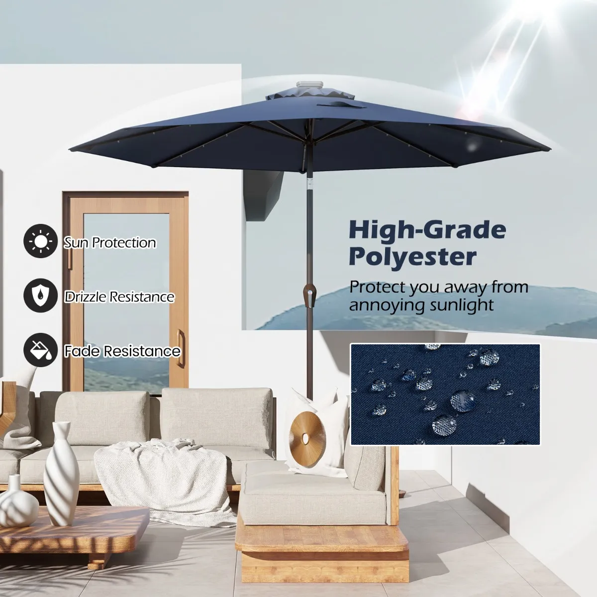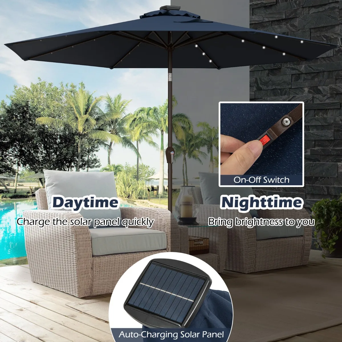 【Energiebesparing met zonne-energieontwerp】Uitgerust met het zonnepaneel aan de bovenkant van de paal, maakt deze parasol gebruik van zonne-energie in plaats van elektrische energie om de stroombehoefte van LED-lampen te ondersteunen, die schoon en milieuvriendelijk is.