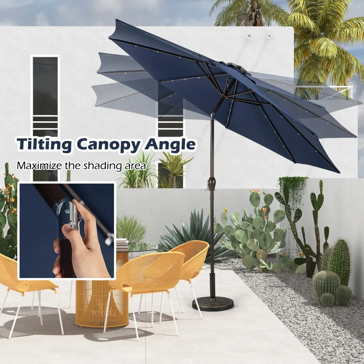 Ontworpen met een moderne uitstraling, zal het een perfecte aanvulling zijn, of het nu voor familie of voor commerciële doeleinden is.Het kan in alle weersomstandigheden worden gebruikt met de grote parasolhoes van 3M om zowel UV als regen te weerstaan. Omdat het kantelt, is er geen ongemak bij de verlichting. In combinatie met het zwengelliftsysteemzal het veel gemakkelijker te gebruiken zijn. Het bovenste zonnepaneel slaat overdag energie op zodat je het ’s nachts kunt gebruiken. Met de zachte LED-vlam zorgt de paraplu voor een romantische sfeer om een geweldige nacht door te brengen.