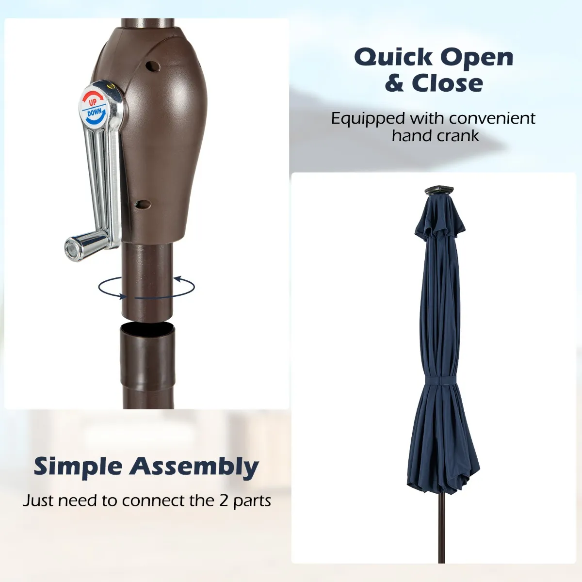 【Kruk Liftsysteem voor eenvoudige bediening】Nooit last van het hoogteprobleem. Deze tuinparasol is voorzien van een zwengelliftsysteem waardoor je hem met minder moeite openklapt. Draai de wip langzaam gelijkmatig en het is gemakkelijk omhoog en omlaag te gaan, zelfs voor kinderen en ouderen.