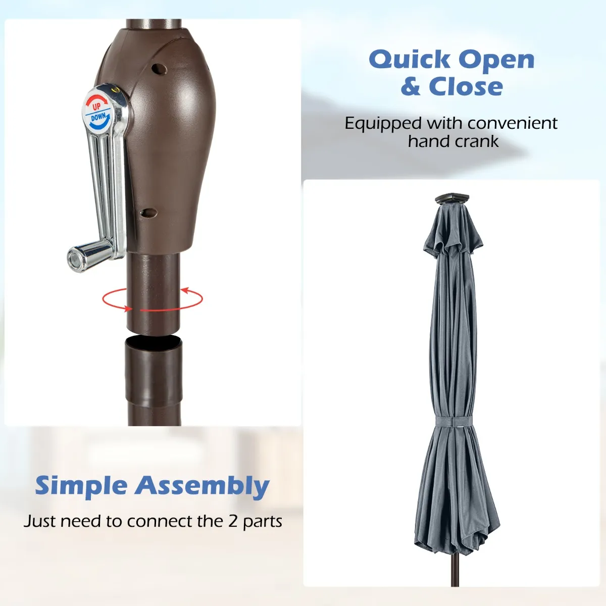 【Kruk Liftsysteem voor eenvoudige bediening】Nooit last van het hoogteprobleem. Deze tuinparasol is voorzien van een zwengelliftsysteem waardoor je hem met minder moeite openklapt. Draai de wip langzaam gelijkmatig en het is gemakkelijk omhoog en omlaag te gaan, zelfs voor kinderen en ouderen.