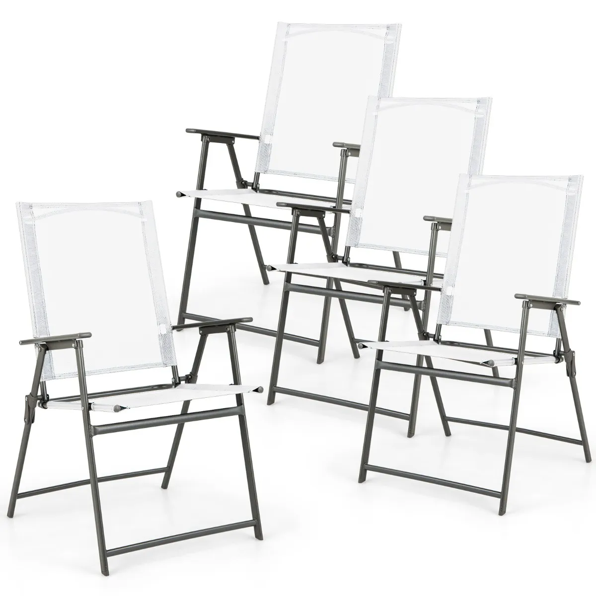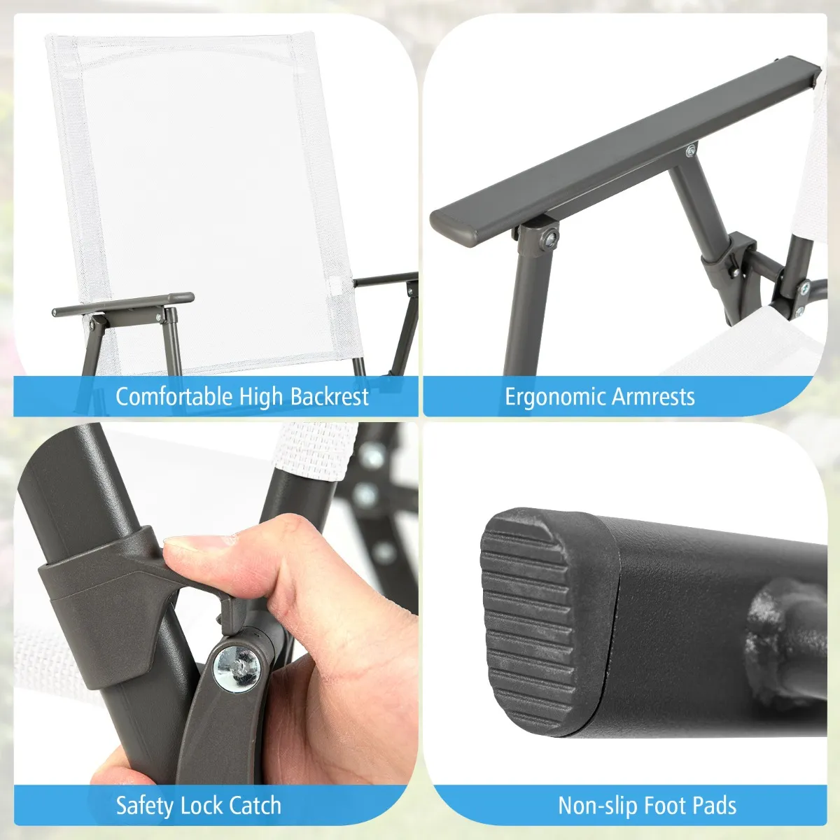 Deze set van 4 terrasstoelen is gemaakt met ademende stof en een stevig metalen frame dat jarenlang gebruik kan doorstaan. Door het inklapbare ontwerp zijn ze gemakkelijk op te bergen en te vervoeren, ideaal voor buitengebruik. De hoge rugleuningen, brede zittingen en gladde armleuningen zijn ergonomisch ontworpen voor een comfortabele zitervaring. Deze metalen terrasstoelenset kan worden gecombineerd met verschillende tafels, perfect voor in de tuin, achtertuin, op het balkon, bij het zwembad, in de eetkamer enzovoort, zodat je kunt genieten van je vrije tijd met familie en vrienden.