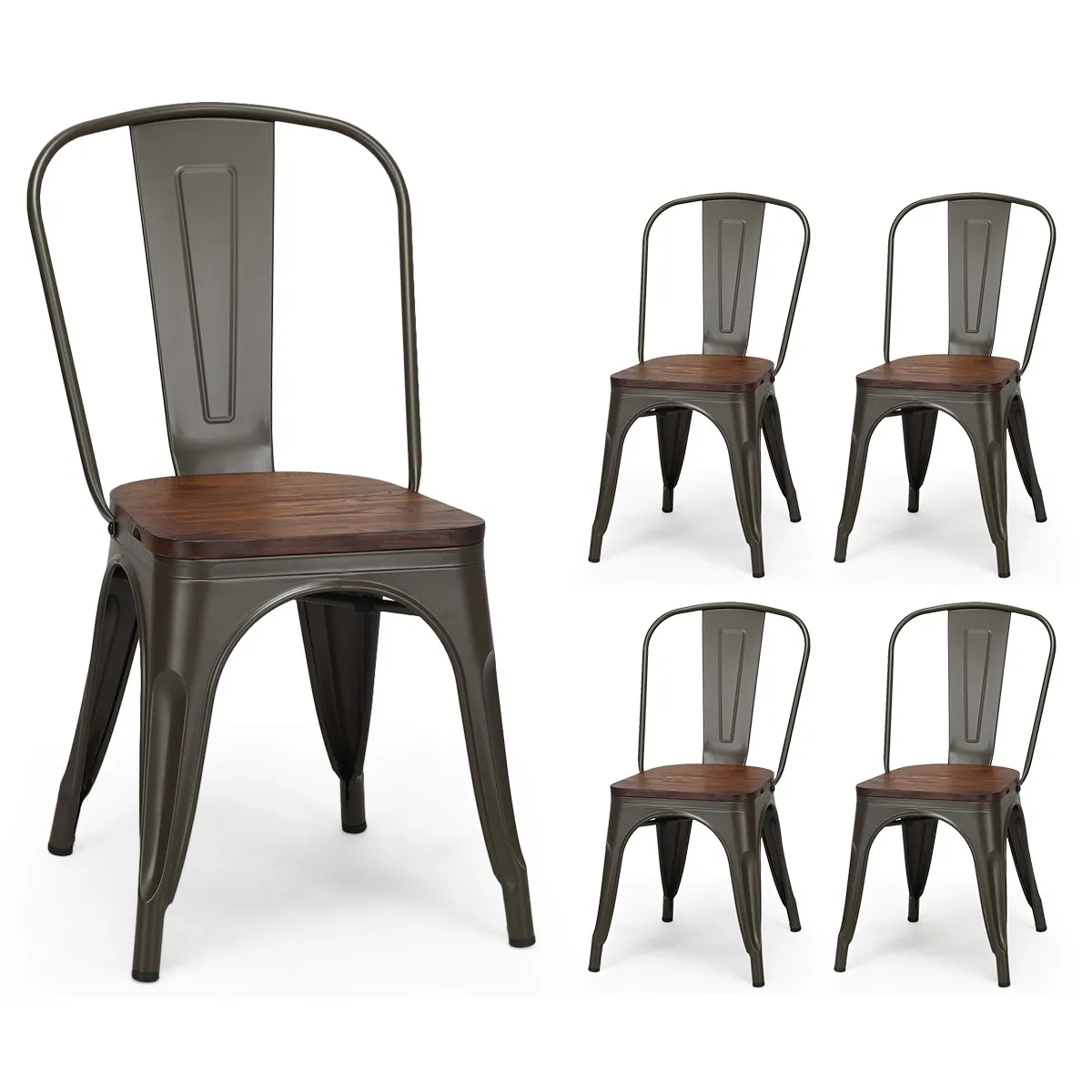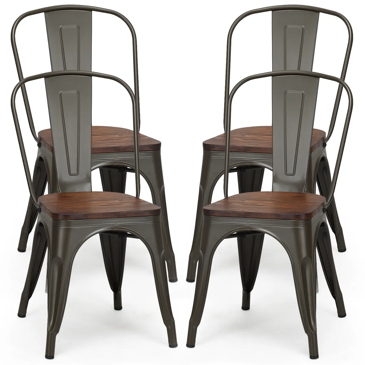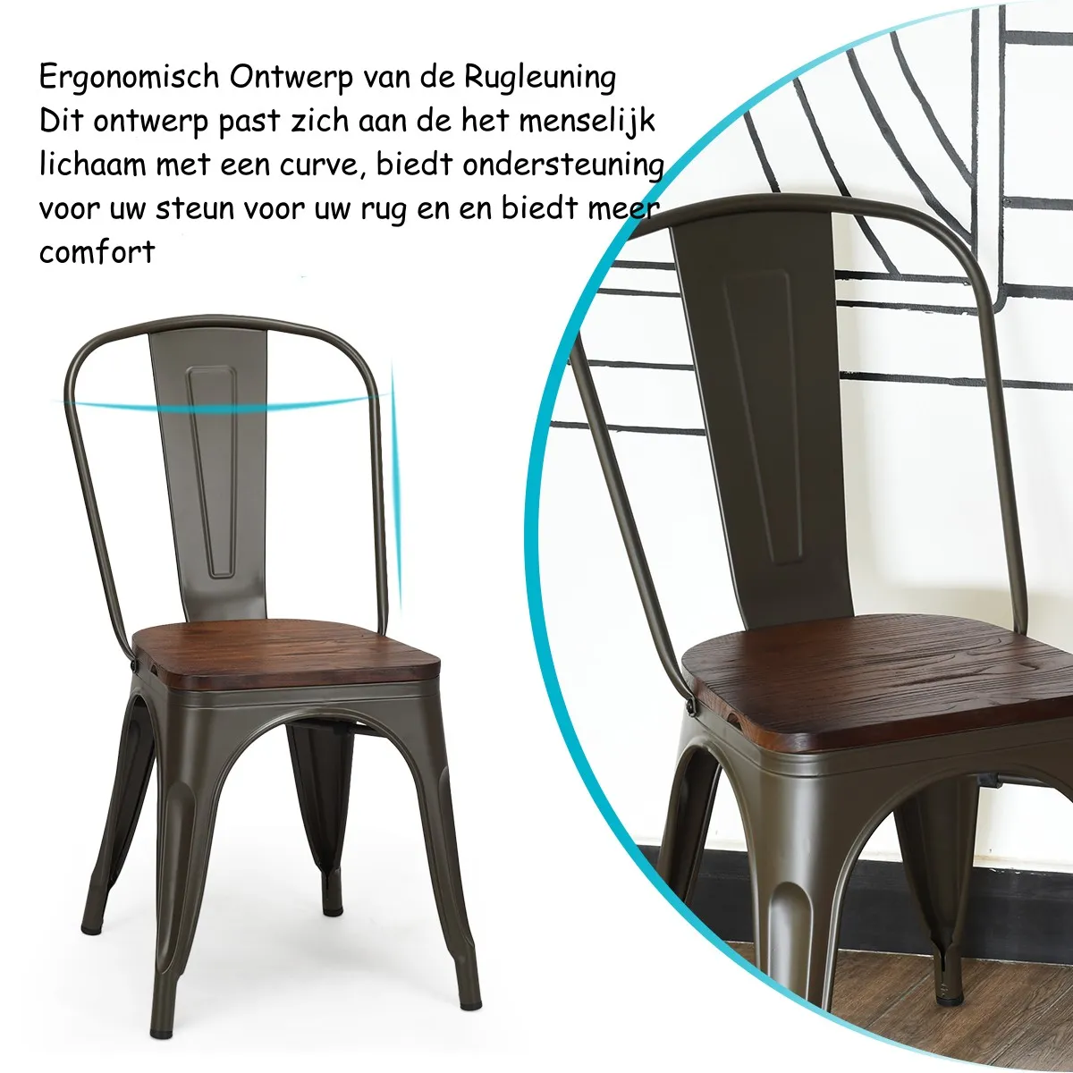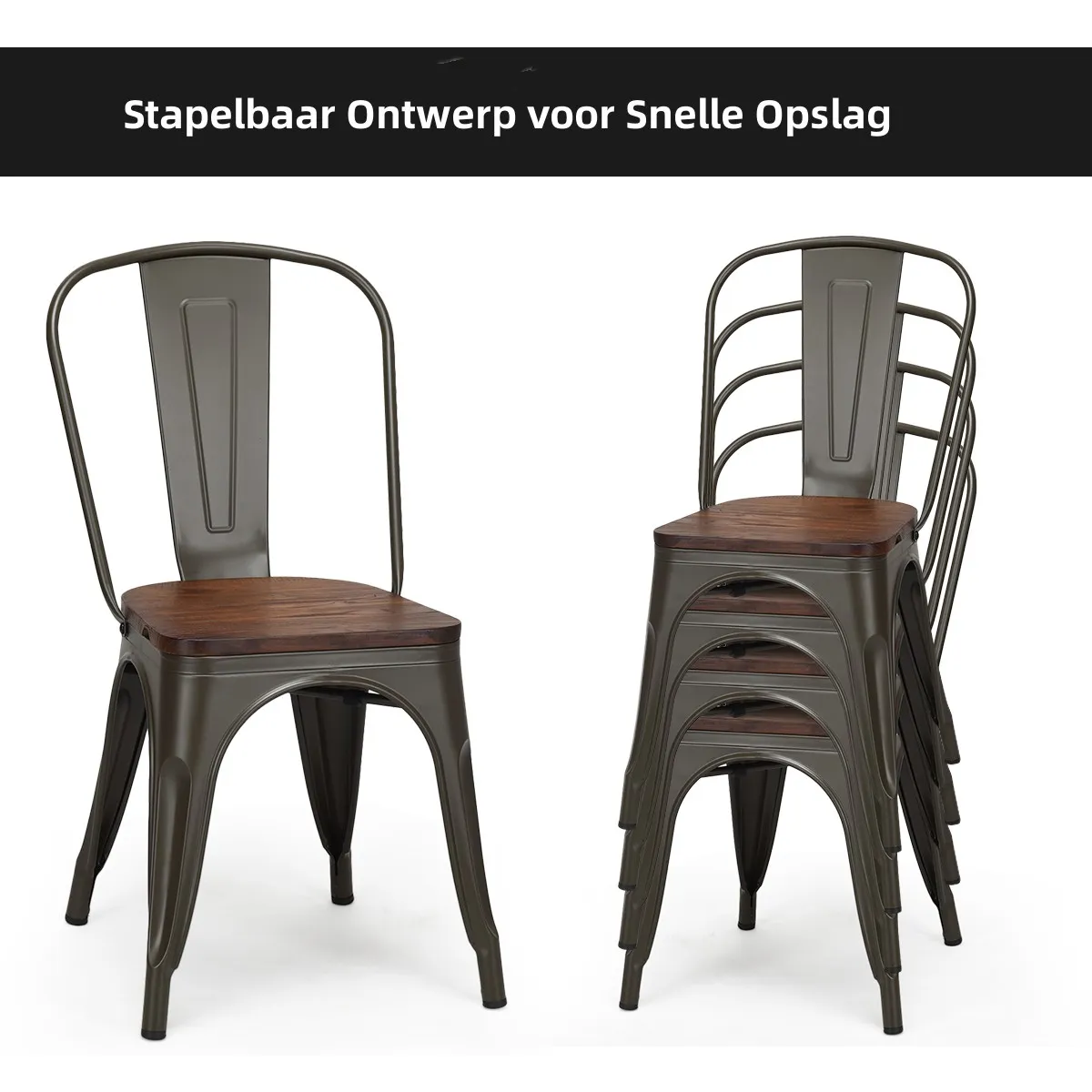 Uitgerust met een versterkt stalen frame zijn deze metalen stoelen stevig en sterk, waarbij de X-vormige steunen voor nog meer stabiliteit zorgen, waardoor ze een draagvermogen tot 120 kg hebben. Dankzij de zitting van iepenhout en het ergonomische ontwerp bieden deze stoelen u superieur comfort, terwijl de verhoogde rugleuning de spanning vermindert en u in een rechte zithouding houdt. Het stapelbare ontwerp bespaart u veel tijd en moeite bij opslag en vervoer. Bovendien zorgen de antislip rubberen doppen op het onderstel voor nog meer stabiliteit en veiligheid, terwijl ze het geluid verminderen en schade aan de vloer voorkomen wanneer de stoelen erop worden bewogen. De nostalgische kleur en klassieke stijl zullen uw kamer nog meer elegantie geven! Koop ze nu!