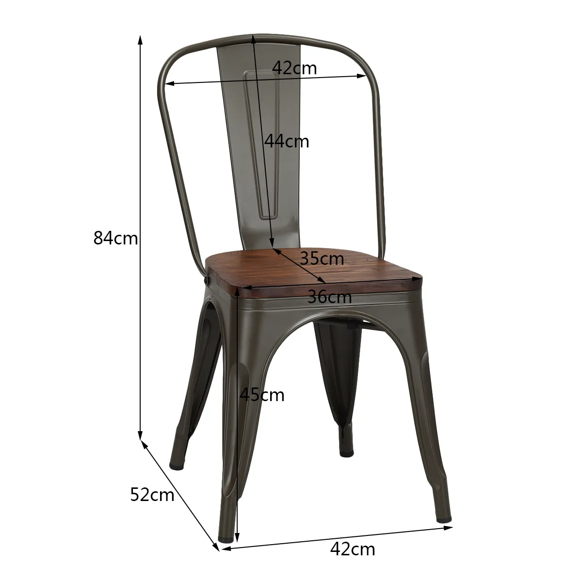 Veelzijdige toepassingsmogelijkheden: Dankzij het eenvoudige en elegante ontwerp combineren onze metalen stoelen het decoratieve effect met functionaliteit, waardoor ze een geweldige aanvulling zullen zijn op uw eetkamer, keuken, bar, café, bistro, koffiehuis, restaurant, enz. Bovendien is de rugleuning afneembaar, zodat u de stoel kunt aanpassen aan verschillende situaties, afhankelijk van uw behoeften en voorkeuren.