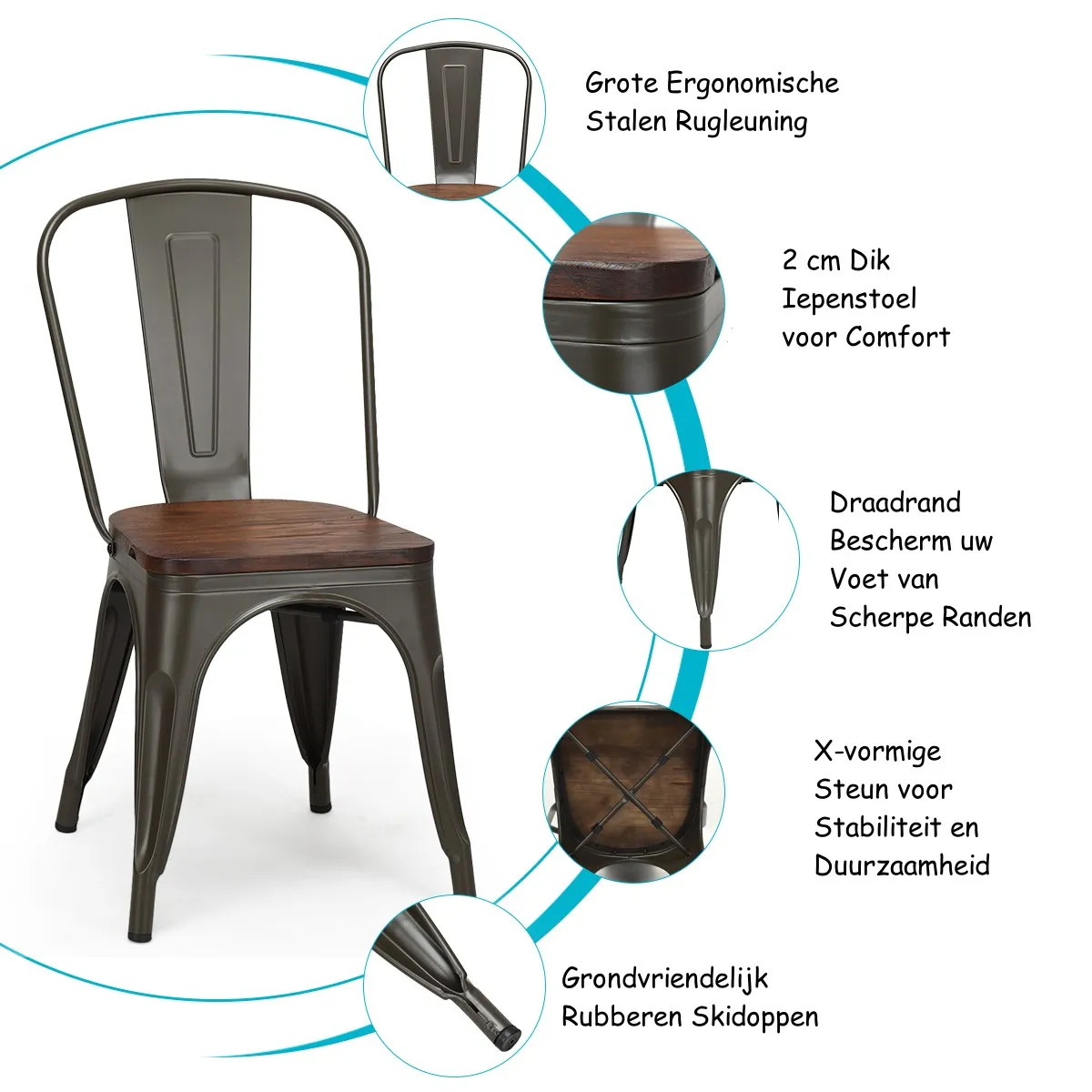 Stabiele & Duurzame constructie: Gemaakt met een versterkt stalen frame, is deze metalen stoel stabiel en sterk om een draagvermogen tot 120 kg te leveren. Bovendien zorgen de X-vormige steunen onder de zitting voor nog meer stabiliteit. De zitting van iepenhout is van hoge kwaliteit, bestand tegen corrosie en waterdicht, zodat u er lang plezier van zult hebben.