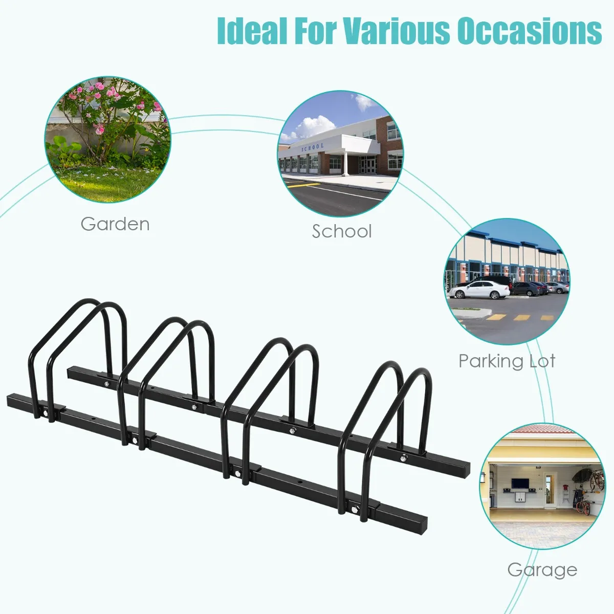 【Brede toepassing】Elk fietsenrek heeft verschillende ruime posities voor het stallen van fietsen. U kunt diverse soorten fietsen in het rek plaatsen, zoals kinderfietsen, mountainbikes en stuntfietsen. Bovendien past de minimalistische stijl van het rek goed in verschillende omgevingen. U kunt het plaatsen in de tuin, garage en gang.
